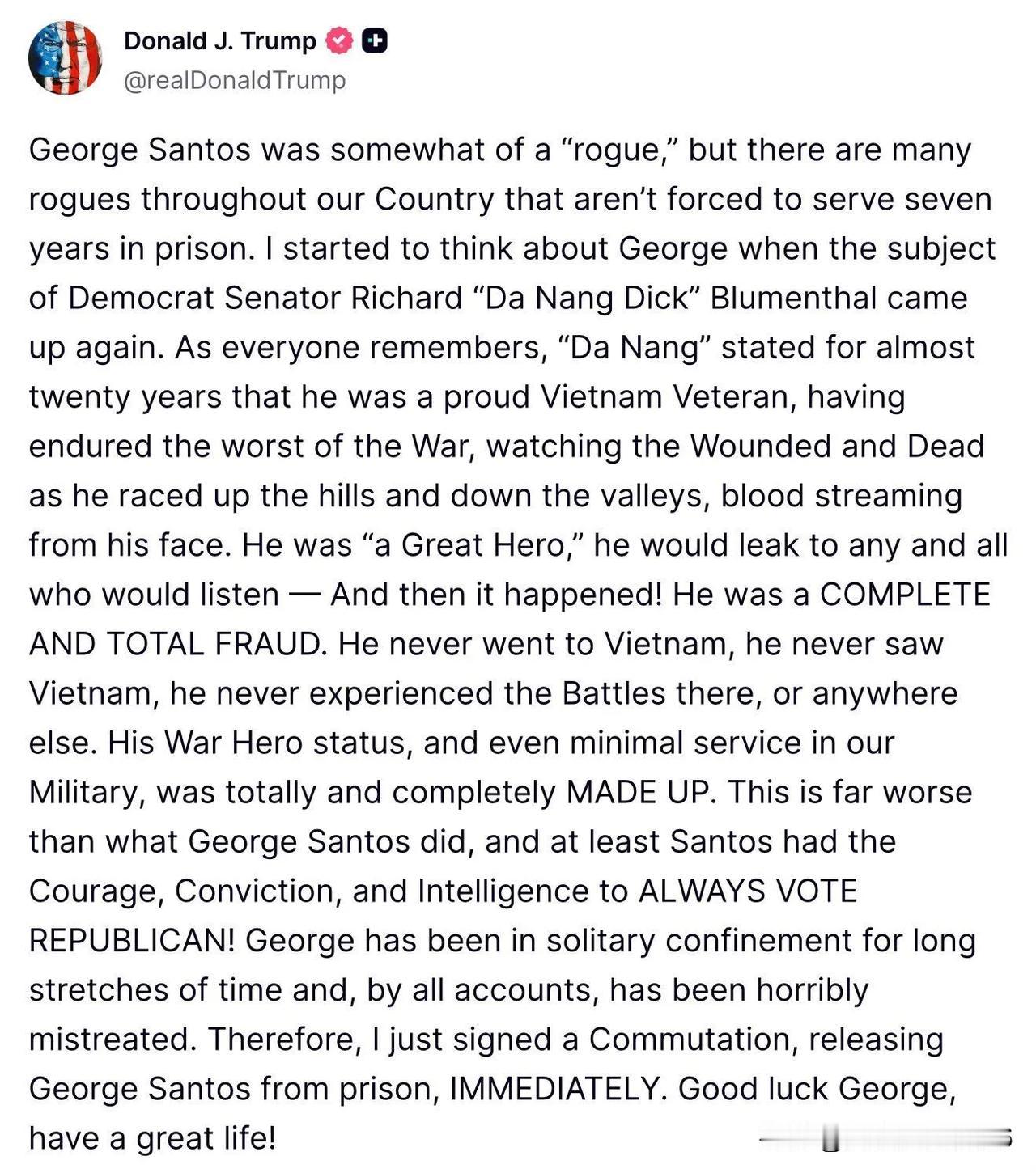 美国总统唐纳德·J·特朗普宣布,他已为前共和党众议员乔治·桑托斯减刑。桑托斯因涉嫌电信欺诈和严重身份盗窃,于2025年4月被判处87个月联邦监禁,罪名是其在2020年竞选期间窃取了支持者数十万美元资金。由于特朗普总统的减刑,桑托斯可以立即从新泽西州费尔顿联邦惩教所获释。