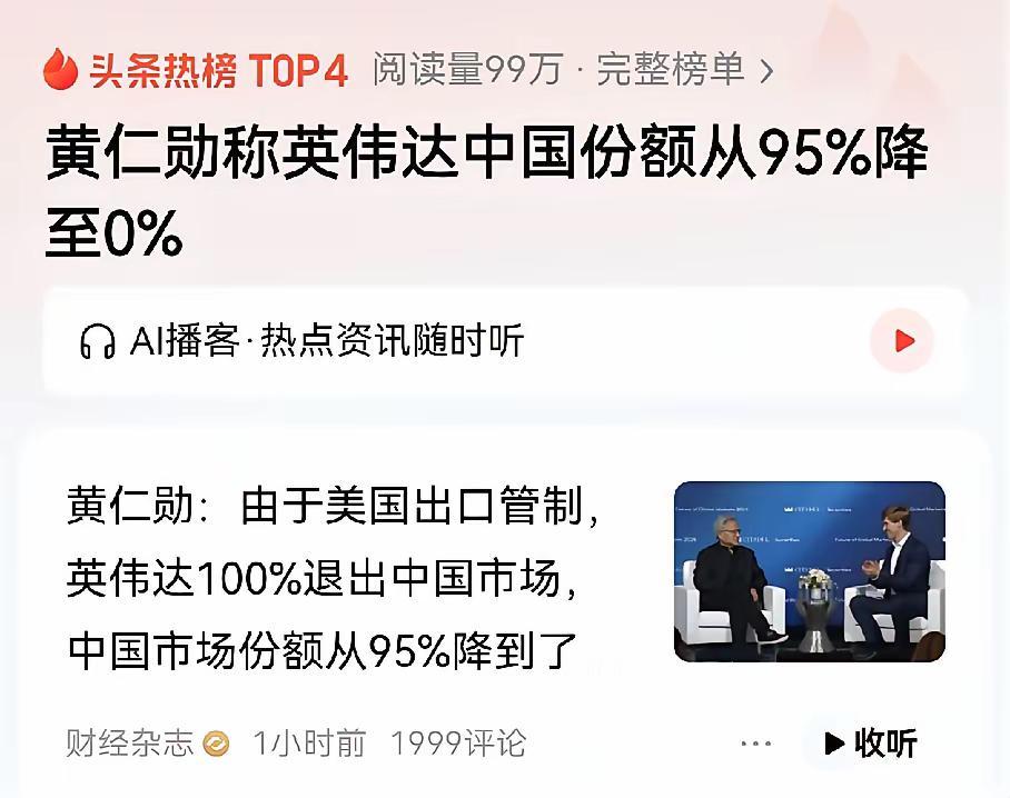 有意思,英伟达市场份额从95%直接清零,居然有人这样洗地,真是大开眼界 Citadel Securities对话中,黄仁勋与布勒的对话火了,长心的人看到的是,他市场份额直接清零后的清醒,不长心的却看到,没有了大陆市场,英伟达收入越来越高。 你可别被“收入越来越高”这几个字骗了,先掰扯清楚这个“市场份额清零”到底是怎么回事——根本不是英伟达丢了整个大陆市场,而是美国对华芯片管制下,它不能再向大陆出售最顶尖的H100、H200这类AI芯片,这块曾经占全球高端AI芯片市场95%的蛋糕,才被迫从它手里滑走。那些洗地的人,故意把“高端市场清零”偷换成“失去大陆市场”,这猫腻藏得够深的。 谁不知道,黄仁勋能把英伟达从一家濒临破产的显卡公司,做成全球AI芯片的“扛把子”,大陆市场功不可没。早年间英伟达靠游戏显卡吃饭,2016年押注AI芯片后,第一个爆发的大市场就是大陆。那会儿百度、阿里、腾讯这些互联网巨头,还有商汤、旷视这些AI公司,几乎清一色用的是英伟达的GPU,单是2022年,大陆市场就贡献了英伟达全球营收的24%——换句话说,每赚4块钱,就有1块来自中国。黄仁勋自己早年在公开场合都说过:“没有中国客户的信任,就没有英伟达的今天。” 可美国一纸管制令下来,英伟达瞬间陷入两难。不卖高端芯片,大陆客户就得找替代品;卖,又违反规定。黄仁勋哪甘心丢了这块肥肉?连夜让工程师们加班加点,搞出了“阉割版”芯片——比如H20、L20这些型号,把算力砍了一大半,刚好卡在合规红线内。就这操作,光研发调整架构就花了近10亿美元,生产线上的晶圆都得重新适配,成本涨了不少,但至少能接着向大陆卖货。那些洗地的人只看到收入没跌,却没算过英伟达为了保住市场,背地里砸了多少真金白银。 更有意思的是黄仁勋在对话里的“清醒”。他跟布勒说“市场份额清零不是结束,是新的开始”,这话哪是放弃大陆市场?分明是知道高端市场丢了,得赶紧在中端市场站稳脚跟。要知道,AI芯片这东西,不光靠技术,还得靠应用场景打磨——大陆有全球最多的AI应用场景,从自动驾驶到智慧城市,这些场景里跑出来的数据,才能反过来优化芯片性能。现在英伟达只能卖阉割版芯片,等于把高端芯片的“练兵场”让给了别人,长此以往,它的技术迭代速度迟早会慢下来。 那些喊着“没有大陆市场英伟达照样赚”的人,怕是忘了产业链的基本逻辑。英伟达需要大陆的市场来摊薄研发成本,大陆需要英伟达的芯片来推进AI落地,这本来是双向奔赴的事。现在美国硬要插一脚,英伟达看似靠阉割版芯片保住了收入,实则是在“饮鸩止渴”——去年华为昇腾910B芯片已经能支撑起大模型训练,国内不少企业开始转向国产芯片,要是哪天国产芯片在中端市场站稳了,再往高端突破,英伟达想再抢回市场,可就没那么容易了。 黄仁勋心里门儿清,所以他一边嘴上说着“尊重规则”,一边悄悄在上海建了研发中心,专门针对大陆市场做芯片优化。他的“清醒”,是看清了大陆市场的不可替代性;而那些洗地的人,只盯着短期的收入数字,却看不到长期的技术主动权正在慢慢转移。说白了,这哪是英伟达“离开大陆照样行”,分明是它拼尽全力,才勉强没被挤出大陆市场而已。 各位读者你们怎么看?欢迎在评论区讨论。
