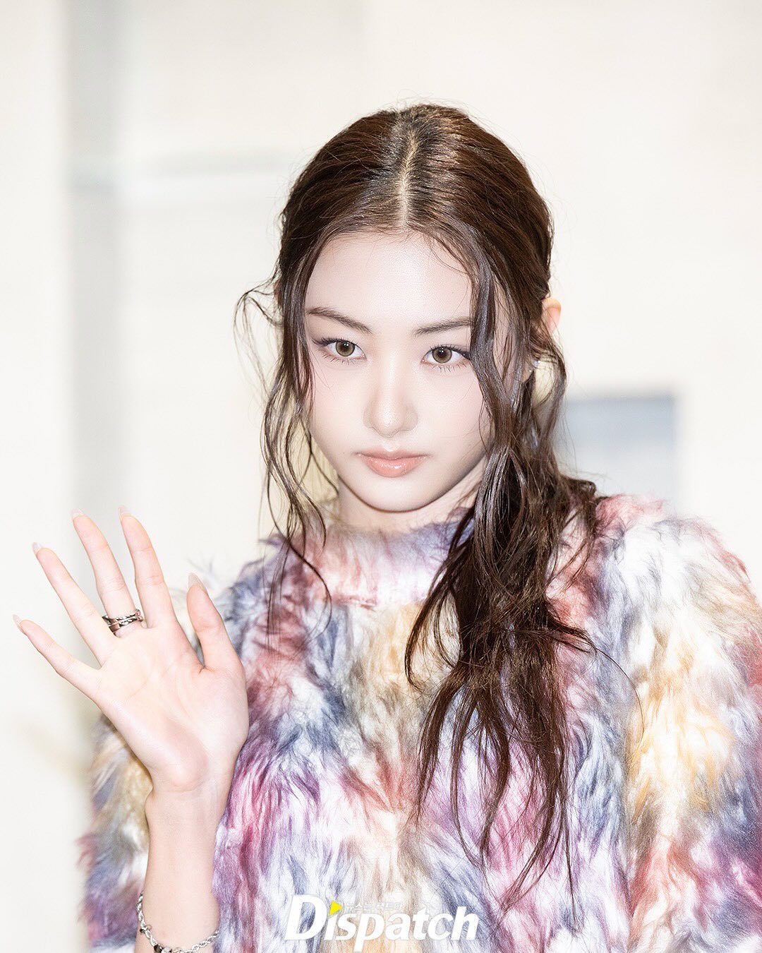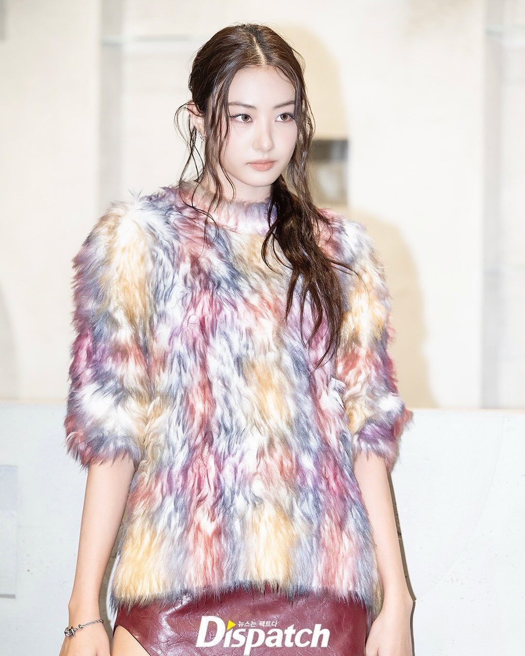 彩虹毛衣有点吃脖子,但红棕色圆弧皮短裙、手袋及一字高跟鞋三大单品挑得特别好,时髦利落,中和了毛衣的厚重感,衣品和驾驭能力依然出挑。