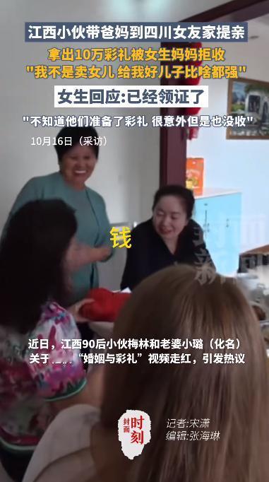 “这个丈母娘火了!”四川,一小伙带着自己的父母到女友家里提亲,期间小伙的父母拿出来了10万块钱,表示这是给他们家的彩礼,谁知女方父母当场就拒绝了,表示你们的儿子已经这么优秀了,我还要这些钱干什么! 麻烦各位读者点一下右上角的“关注”,留下您的精彩评论与大家一同探讨,感谢您的强烈支持! 江西小伙梅林带着父母去四川提亲,手里攥着凑了大半年的10万块彩礼。没成想刚递出去,就被准丈母娘轻轻推了回来。 准丈母娘看着他们惊讶的样子,语气很实在:“我要的是小梅嫁过去能好好过日子,不是让你们掏家底。 这十万块你们现在拿出来,将来小两口还房贷、养孩子怎么办?最后苦的还是我女儿。” 旁边的准岳父也补了句:“养女儿二十多年,不是为了卖钱,是盼她后半辈子踏实。” 梅林听了心里发酸,他知道这笔钱对自家不是小数,却也明白准丈母娘的心意。 他没接回钱,反而说:“这钱我想留给小梅,当我们俩过日子的启动资金,不让爸妈再操心。” 准丈母娘琢磨了会儿,点头应了,最后约定把钱存成定期,将来用在买房或养孩子上,不添两家负担,也不给小两口的日子埋雷。 这事传开后,网友都夸这丈母娘有大格局:“不是不要彩礼,是懂替年轻人着想”“这样的家庭,小两口以后肯定和睦”。 其实现在不少年轻人谈婚论嫁,都被彩礼绊住脚,有人为了凑彩礼借遍亲戚;有人因为彩礼谈不拢,明明相爱的两个人最后散了。 可梅林遇到的这家人,却把婚姻的本质拎得很清:彩礼不是“卖女儿”的价码,也不是“撑面子”的数字,而是要看两家能不能互相体谅,能不能为小两口的未来打算。 就像准丈母娘说的,尊重不是用钱堆出来的,把对方当家人,才是婚姻最好的开头。 现在梅林和女友正忙着规划未来,那笔存起来的钱,成了他们小家庭最实在的底气,不是因为数额多,而是因为背后藏着两家人的真心,这比任何彩礼都珍贵。 那么你们怎么看待这件事呢?欢迎在评论区说说你们的看法吧! 信息来源:《江西小伙带爸妈到四川女友家提亲,拿出10万彩礼被女生妈妈拒收》封面新闻