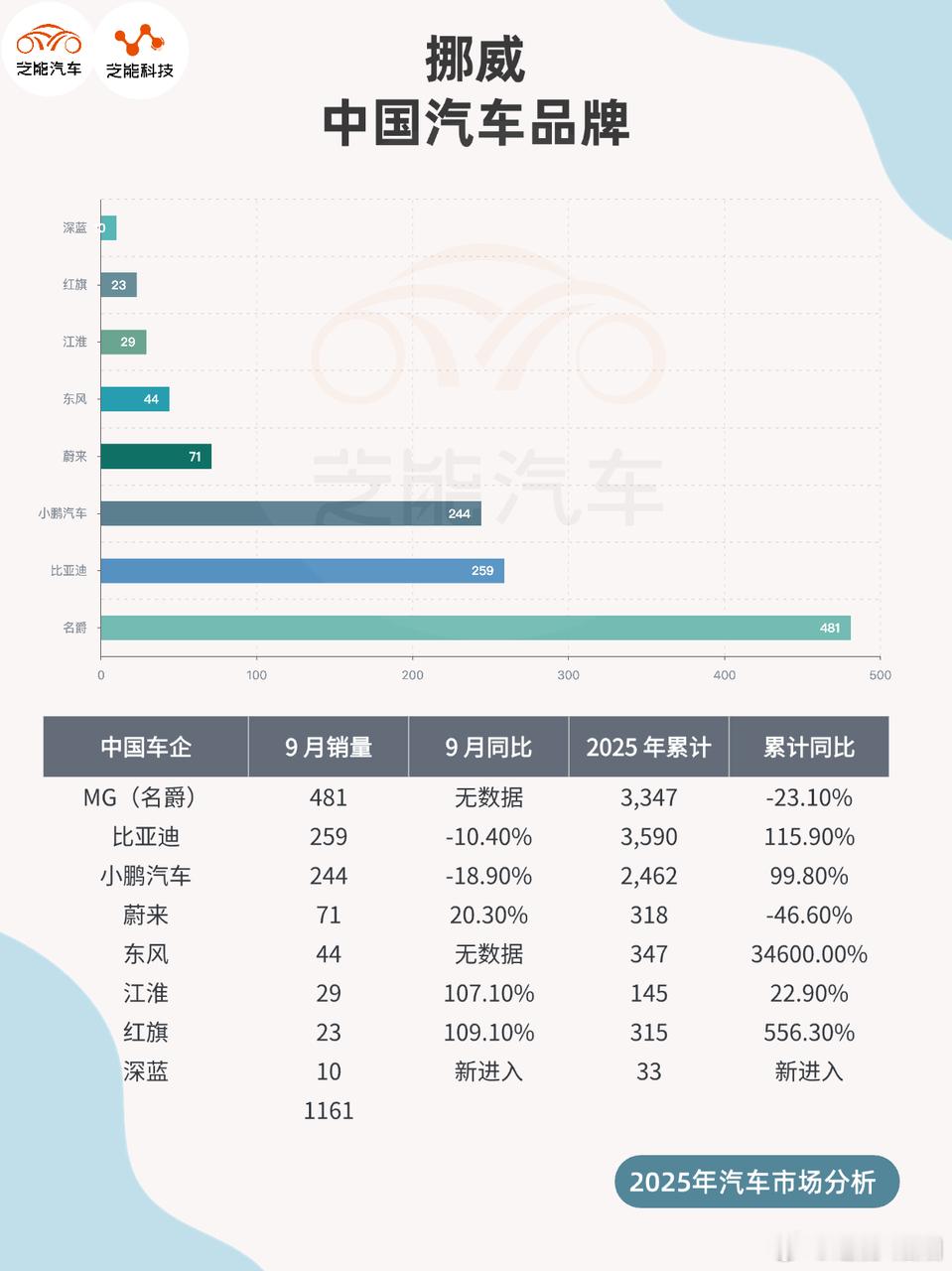 品牌方面,特斯拉凭借 Model Y 的强势表现继续领跑,9 月销量占比约 33.7%。沃尔沃和大众保持稳健,分别以 8.7% 和 7.9% 的份额位居第二、第三。中国品牌中,比亚迪、小鹏、极氪、赛力斯等销量增长明显,虽整体销量占比不算高,但渗透力正在上升。