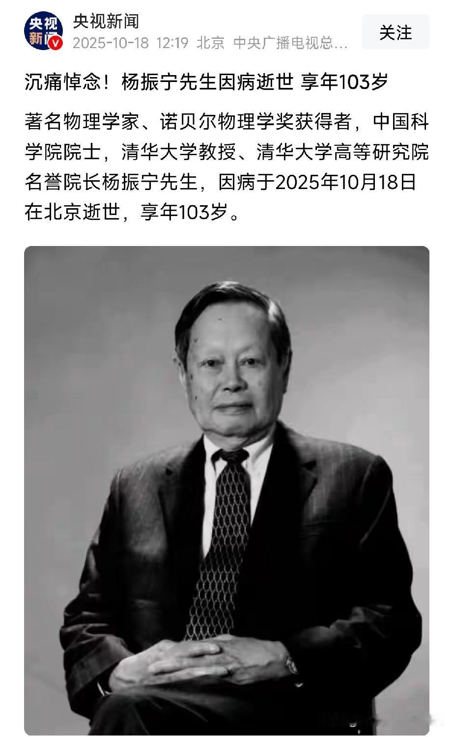 沉痛悼念!杨振宁先生因病逝世 享年103岁 著名物理学家、诺贝尔物理学奖获得者,中国科学院院士,清华大学教授、清华大学高等研究院名誉院长杨振宁先生,因病于2025年10月18日在北京逝世,享年103岁。