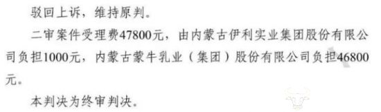 在今年9月,江苏省高级人民法院作出终审判决,驳回上诉,维持原判,即蒙牛构成不正当竞争,应立即停止侵权行为,并赔偿伊利经济损失及合理开支共计500万元。