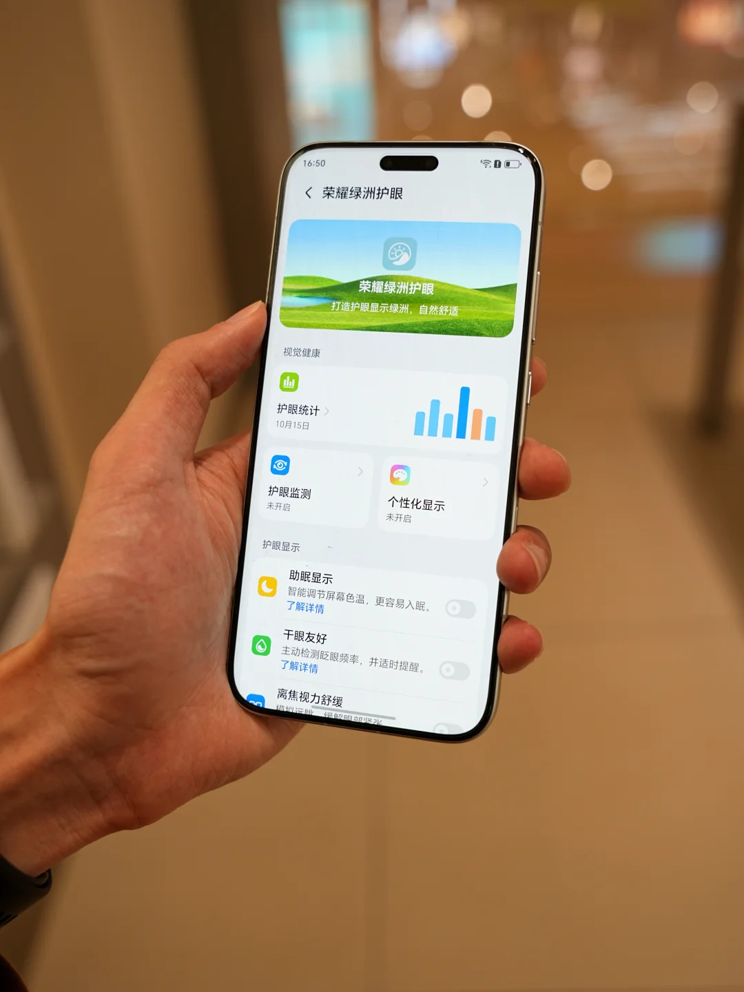 在护眼上有圆偏振光,低亮度4320Hz高频PWM调光护眼,如果你是工作用手机很多的话,那这些护眼功能就是为你量身定做的。我平时就默认打开护眼检测,荣耀内置的AI护眼自动帮我调节色温显示等等,对眼睛确实好。尤其是有时候刷手机刷上瘾停不下来,护眼提醒就会让你眨一眨眼,离焦视力舒缓帮你缓解眼部压力,你们说这是不是把护眼做到极限了?