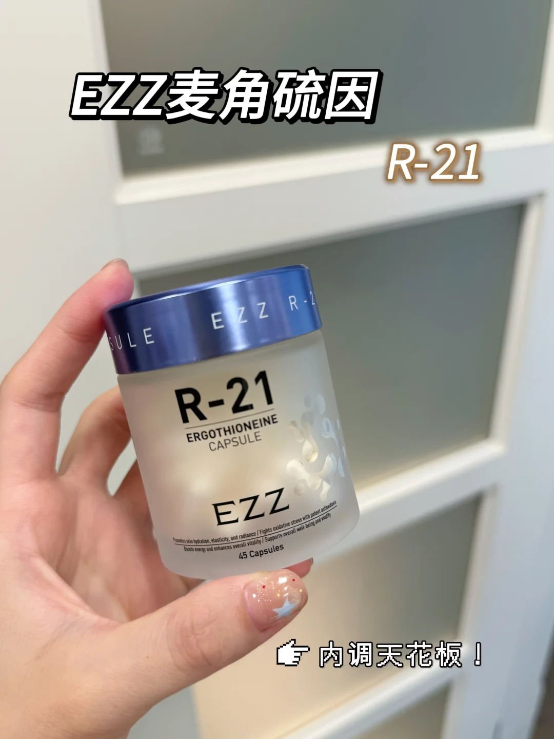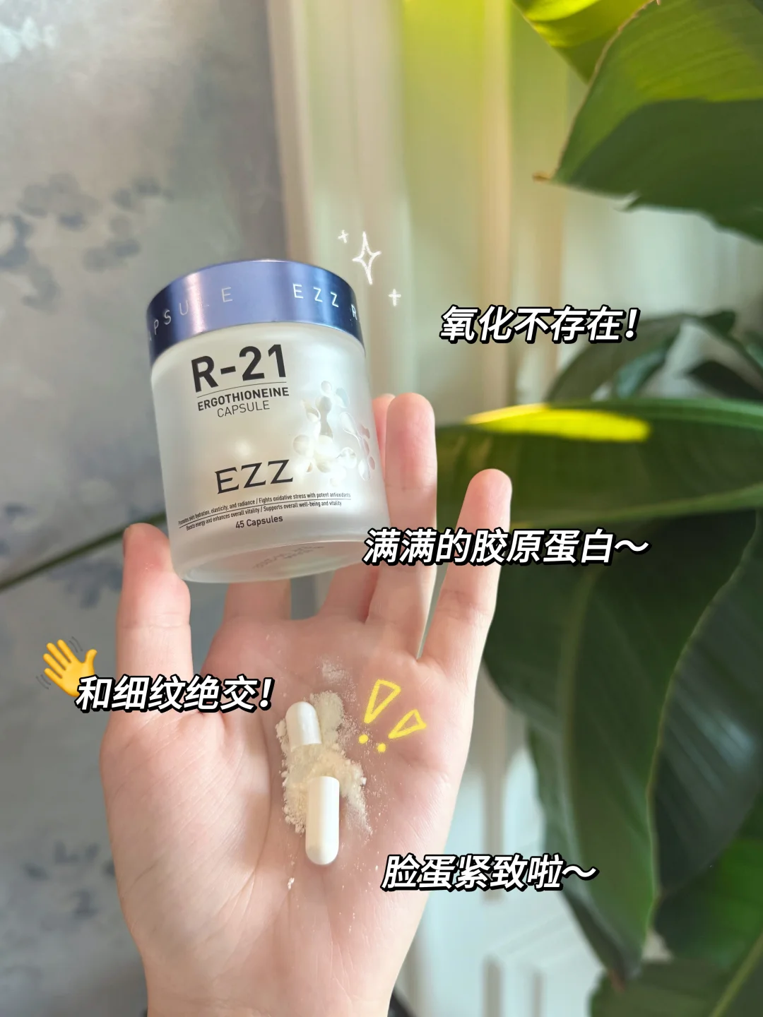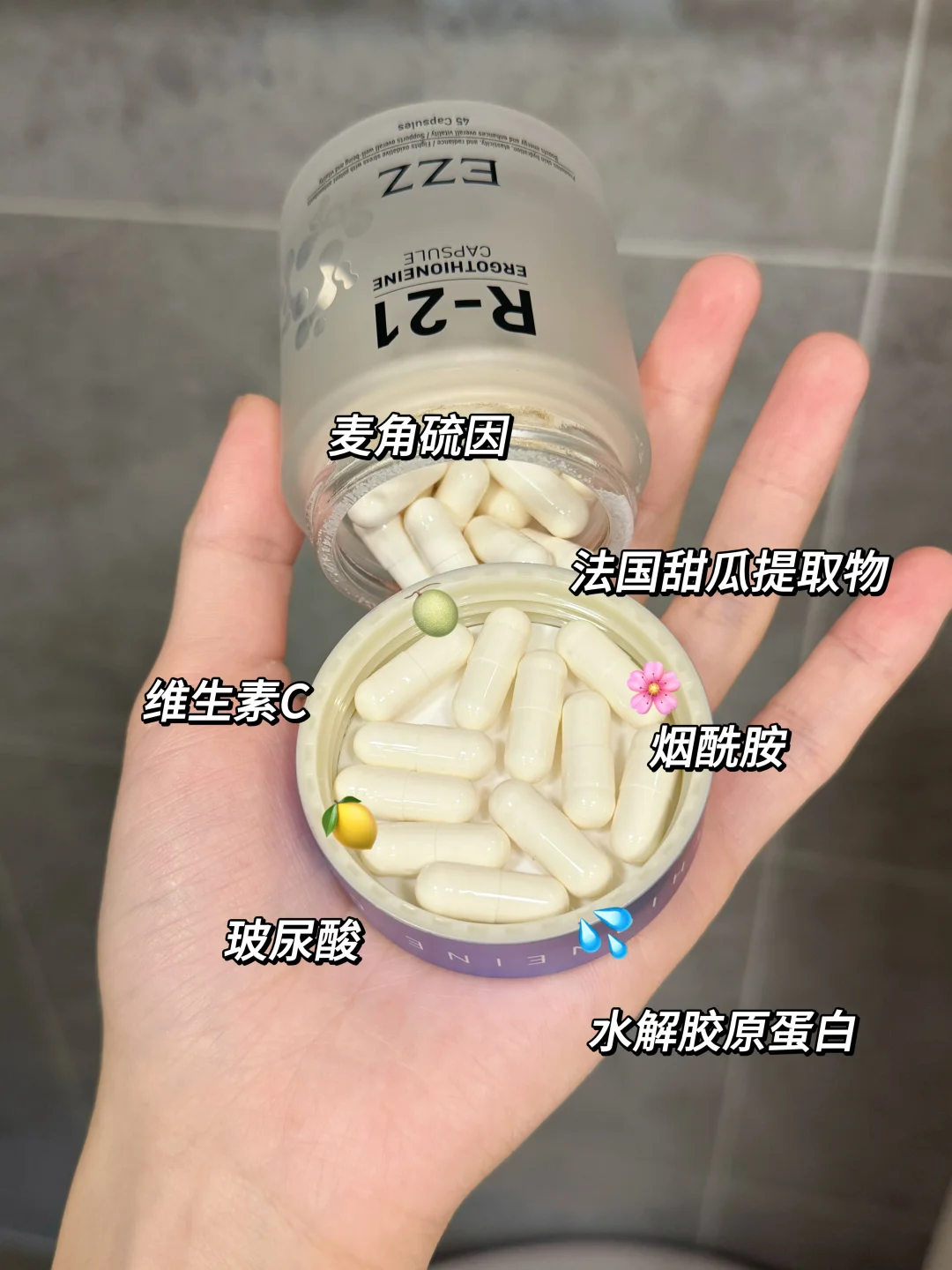 后来尝试了“内服养肤”,做足了功课选了EZZ麦角硫因R-21胶囊💊听这个名字就知道它主要成分就是抗氧尖子生—麦角硫因,两粒含量大约有60mg的麦角硫因,约等于1.5斤的灵芝!!麦角硫因协同法国甜瓜提取物抗氧,效果1+1>2;玻尿酸搭配水解胶原蛋白,补水滋润,让肌肤喝饱水;丰富的维生素C和烟酰胺,还会助我们白白!暗沉发黄的皮肤有救了!🧐一瓶抗氧亮白滋润全搞定!而且EZZ麦角硫因采用化学酶法萃取技术和核心酶法技术,纯度高的同时更容易吸收,产品通过了SGS检测认证,还有21天真人实测的检测报告,内服产品就要选这种靠谱的!