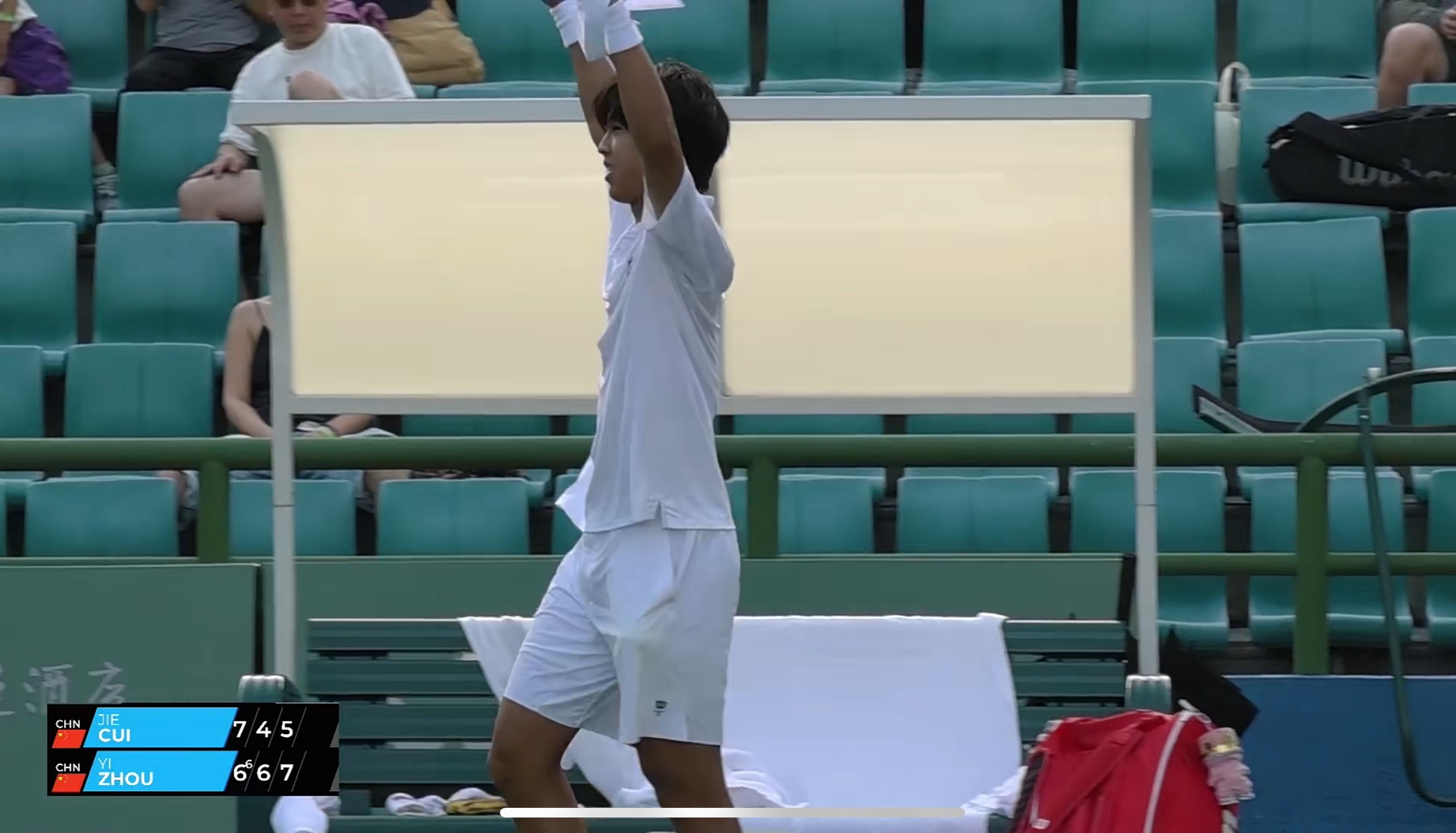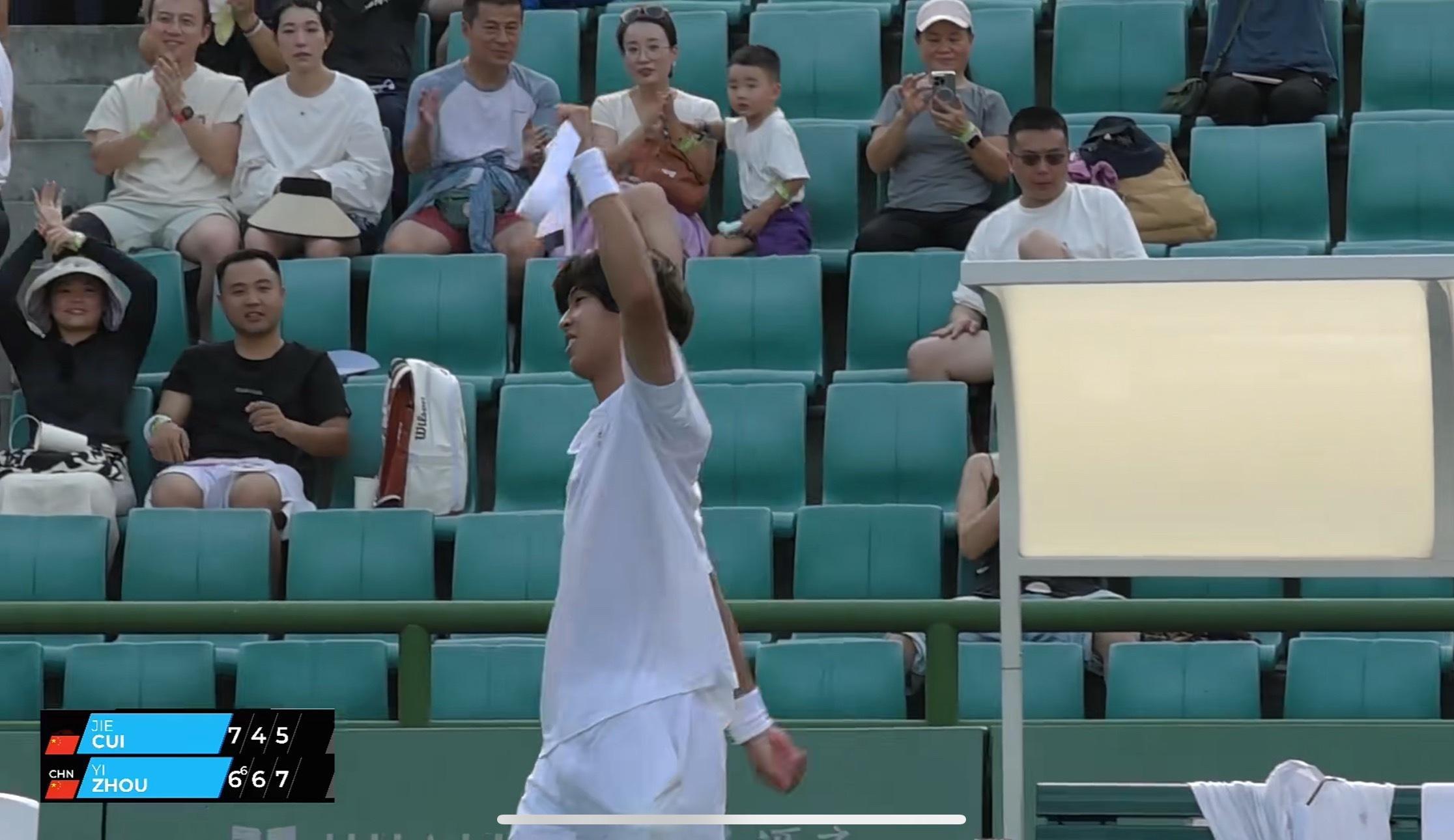 周意大战2小时40分钟,终于以6-7(6)、6-4、7-5逆转崔杰,率先挺进深圳