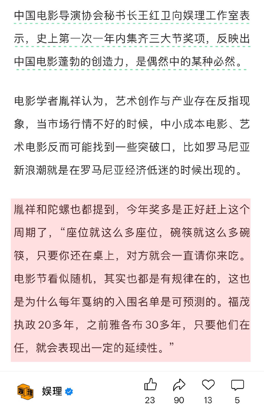 缺钱仍是电影行业最现实的困境 电影节能助力电影宣发吗 今年中国电影在国际电影节上屡创佳绩,辛芷蕾、舒淇、毕赣、霍猛等均有奖项到手。爆发也是多点位的,既有鼓励幕后的,也有鼓励演员的,既有中国本土题材的,也有较为纯粹的艺术性探索。而且这些获奖者大多不是传统学院派导演系出身,成长路径多元,也都比较年轻。娱理独家↓