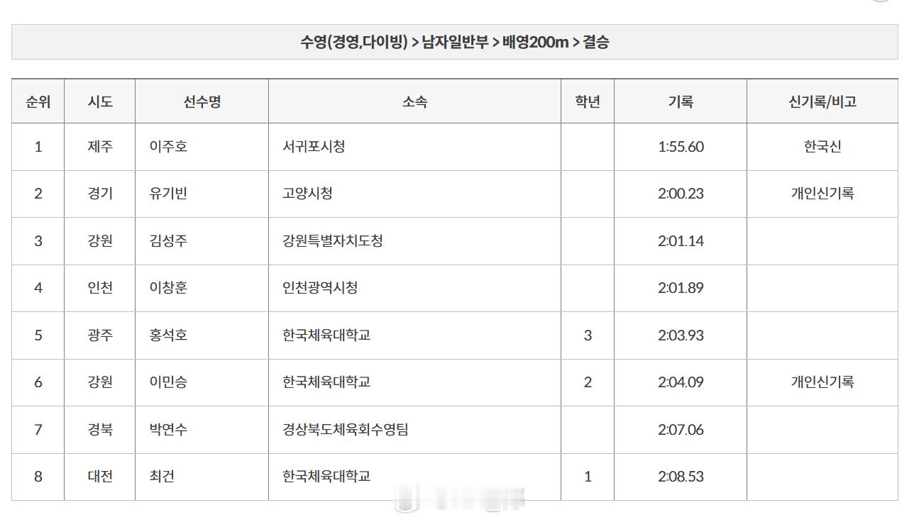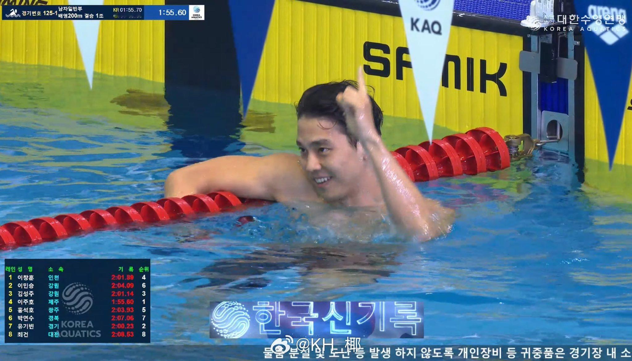 第106届韩国体育节男200仰决赛李周浩1:55.60NR30岁正是涨成绩