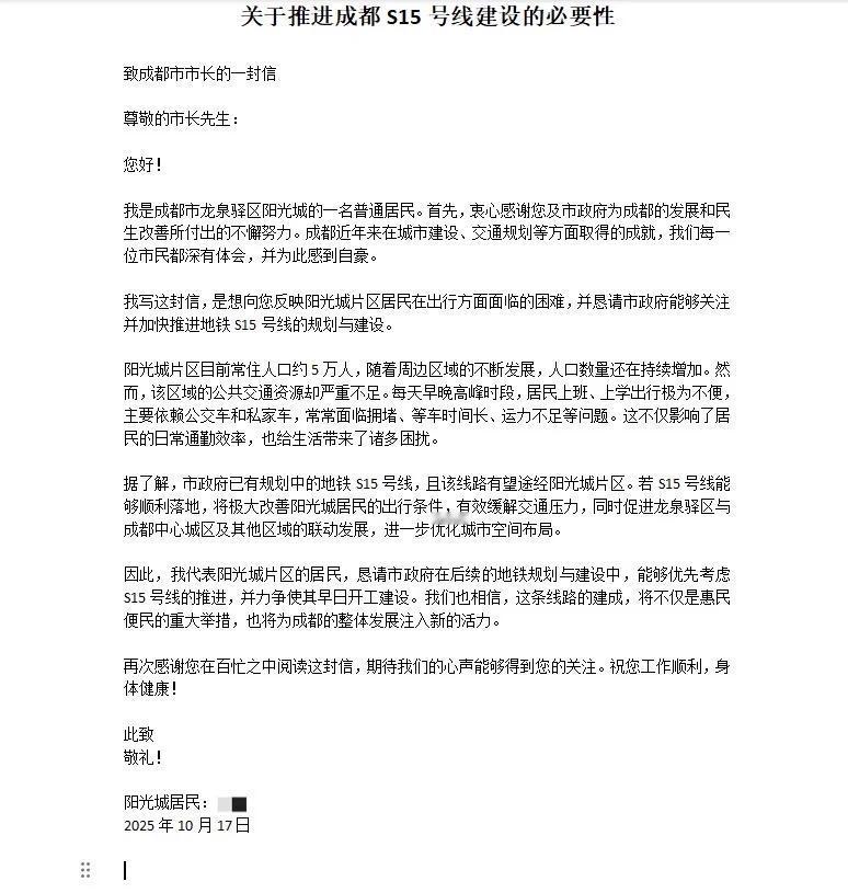 龙泉阳光城S15号线什么时候才开始修建啊 希望大家都去写信给市长 一起发发力 阳光城附近住了大概5万人 交通只能靠大家拼私家车 只要下雨就一定会迟到堵车 真的很不方便 如果这条线可以顺利修建并开通 不仅是惠民的重大举措 也会为成都整体发展注入新的活力!轨道交通 城市交通规划 地铁 阳光城 城市更新改造 交通