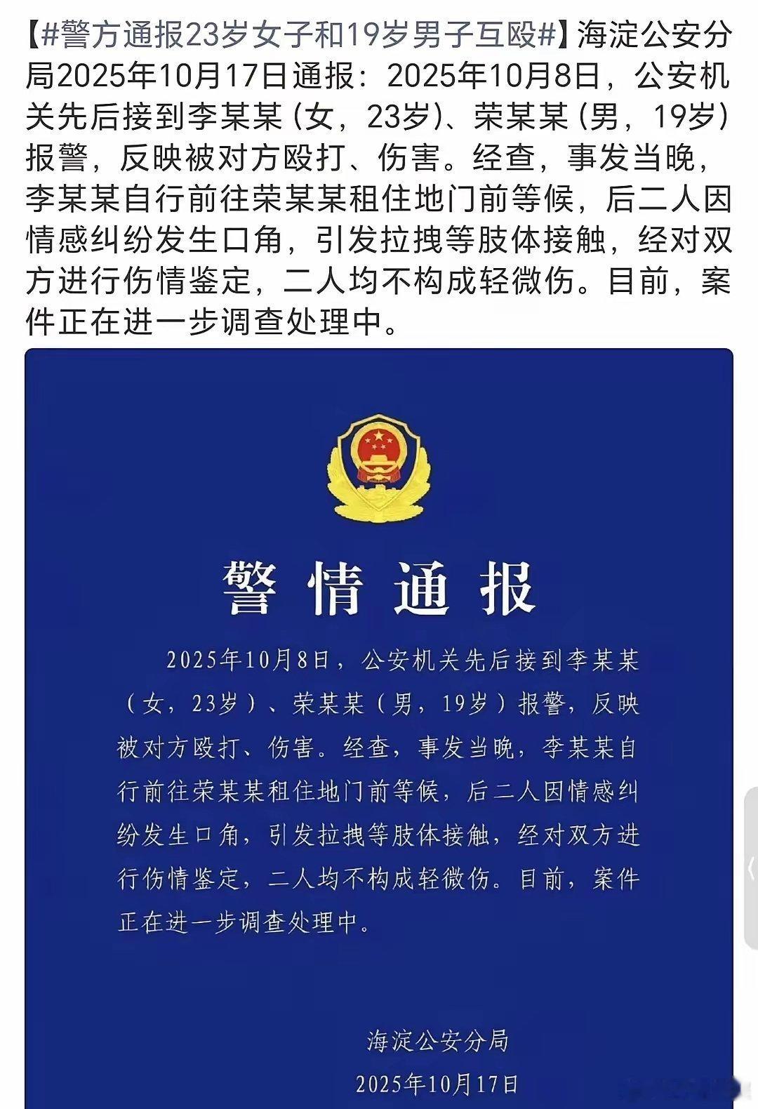 属于荣梓杉的蓝底白字来了,官方证实二人是因为情感纠纷发生口角以及拉拽等肢体接触,