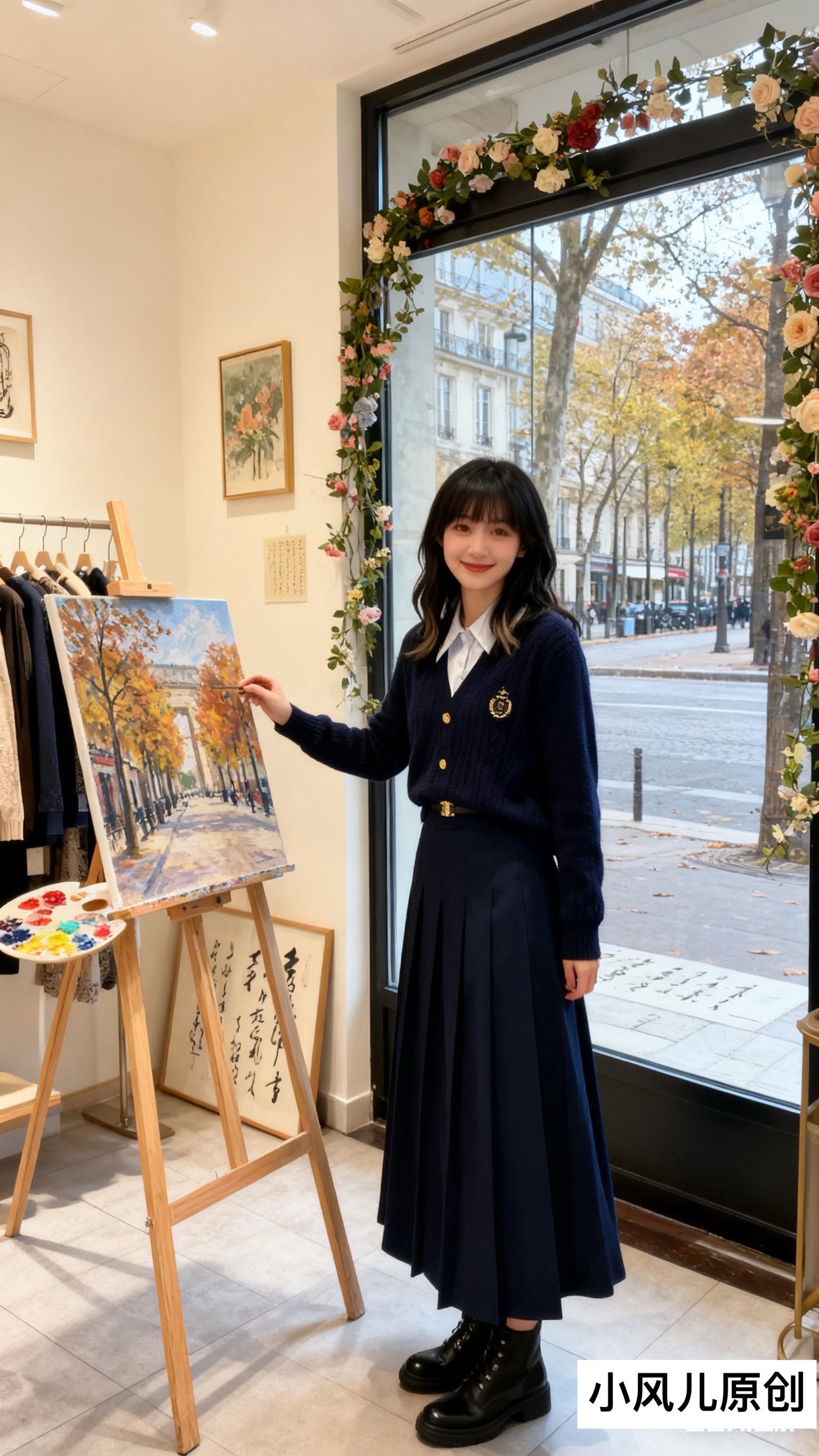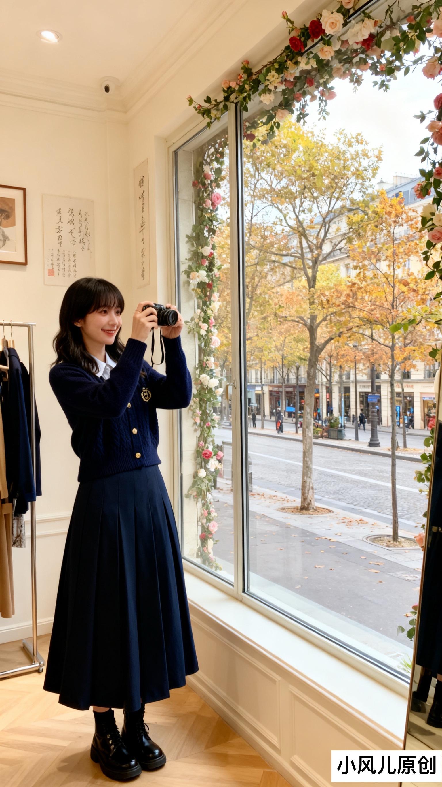 时尚洋气假两件套。秋日服装店,抱布偶猫坐奶油沙发,窗外红黄枫叶绚烂。灰...