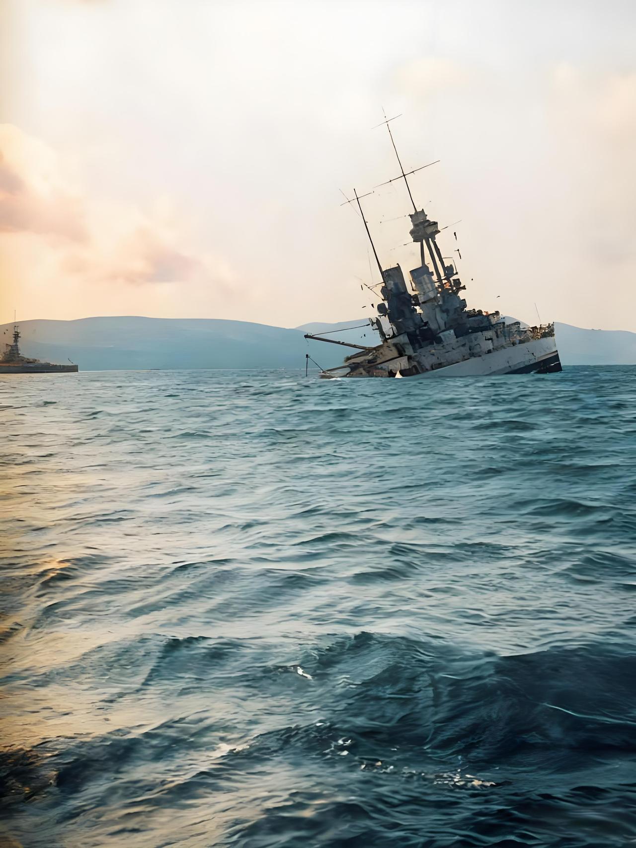 1919年6月21日中午,被协约国扣押在英国斯卡帕湾的德国公海舰队(含11艘战列舰、5艘战列巡洋舰等共74艘舰艇),在舰队司令路德维希·冯·罗伊特海军少将的秘密指令下,集体升起德国海军旗并打开通海阀自沉。此举是为了避免军舰被协约国瓜分,以一种近乎“自杀式”的抗争,捍卫德国海军的尊严。 照片中正在舰艉下沉的战列舰,属于德国巴伐利亚级战列舰(该级共2艘),是一战末期德国最先进的战列舰,装备8门380毫米主炮,火力与防护能力对标英国“伊丽莎白女王”级。它在自沉过程中迅速倾斜沉没,成为此次自沉行动中沉没的主力舰之一。 左侧远端的舰影是“巴登”号,它是“巴伐利亚级”的改进型,也是德国海军为应对英国“复仇”级战列舰而建造的新锐舰。自沉时因进水控制失误最终搁浅(后被英国打捞),成为斯卡帕湾自沉事件中少数未完全沉没的主力舰。 此次行动共导致52艘德国军舰沉没(含11艘战列舰、5艘战列巡洋舰),总吨位超过17万吨,是世界海军史上规模最大的集体自沉行动。协约国的瓜分计划彻底落空,也让英国皇家海军“缴获德国主力舰”的算盘破产。