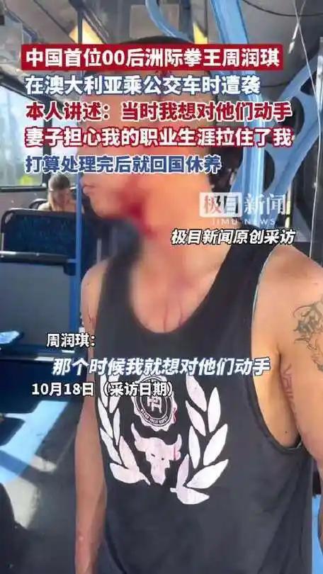 中国首位00后洲际拳王周润琪在澳大利亚的遭遇着实令人心疼。10月14日,他与妻子乘坐公交车时,竟遭到当地土著的种族歧视与暴力袭击。为保护妻子,他头部被类似改锥的锐器刺伤,伤口距离后脑要害仅有几厘米,还昏迷了约十分钟。 周润琪逐梦之路艰难。他15岁开始学武,22岁斩获金腰带,期间还做过销售、洗碗工、外卖员。他本是为了拳击梦想前往澳大利亚,却在赛前遭遇这样的事情。目前,两名凶手已被抓获,他打算处理完相关事宜后回国休养。这次经历,不仅给他带来了身体上的创伤,心理创伤想必也不容小觑。希望他能早日恢复,继续追逐梦想! 周润琪遇袭