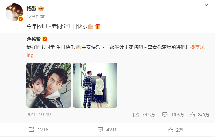 杨紫转发祝李现生日快乐,以转发6年前微博的方式表达心意,没有常规的庆生套路,
