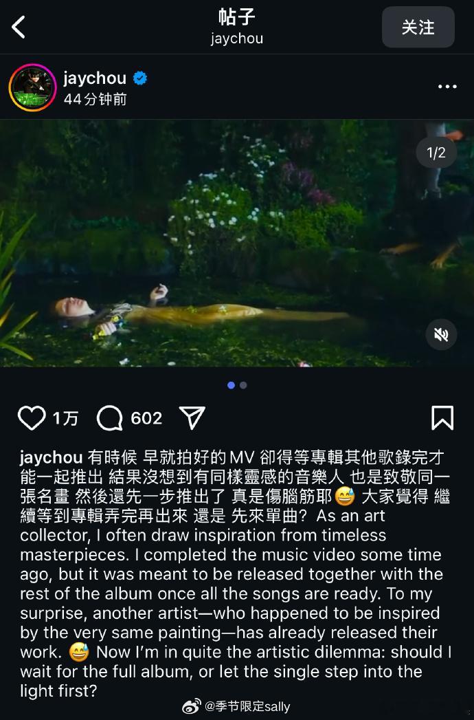 周杰伦发文:有时候,早就拍好的MV,却得等专辑其他歌录完才能一起推出,结果没想到有同样灵感的音乐人,也是致敬同一张名画,然后还先一步退出了,真是伤脑筋耶。大家觉得,继续等到专辑弄完再出来?还是先来单曲?