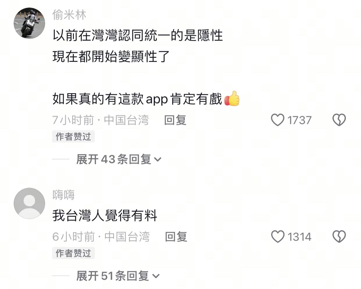 不夸张地讲,这是第一次见到那么多台湾ip的同胞能聚在一个评论区,就为了支持一个“投诚app”的创意,梦想可以预先登记成为支持回归的人,还能提前获得大陆的身份证号,登陆的时候还可以被安全撤离,虽然听起来有的科幻但不少岛上的网友表示真的很需要。有一条湾湾网友的评论很有代表性:以前在灣灣認同統一的是隱性,現在都開始變顯性了。