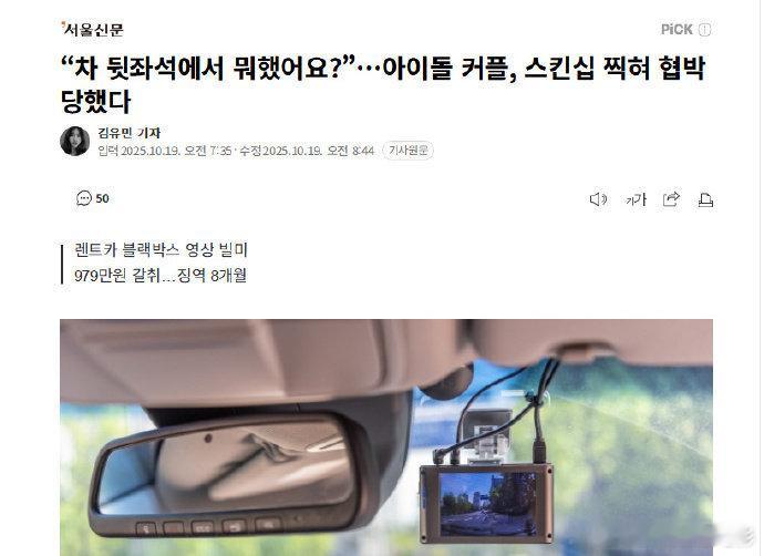 韩国爱豆被租车老板利用行车记录仪拍下的亲密视频要挟,敲诈979.3韩元(约5万人民币)😯