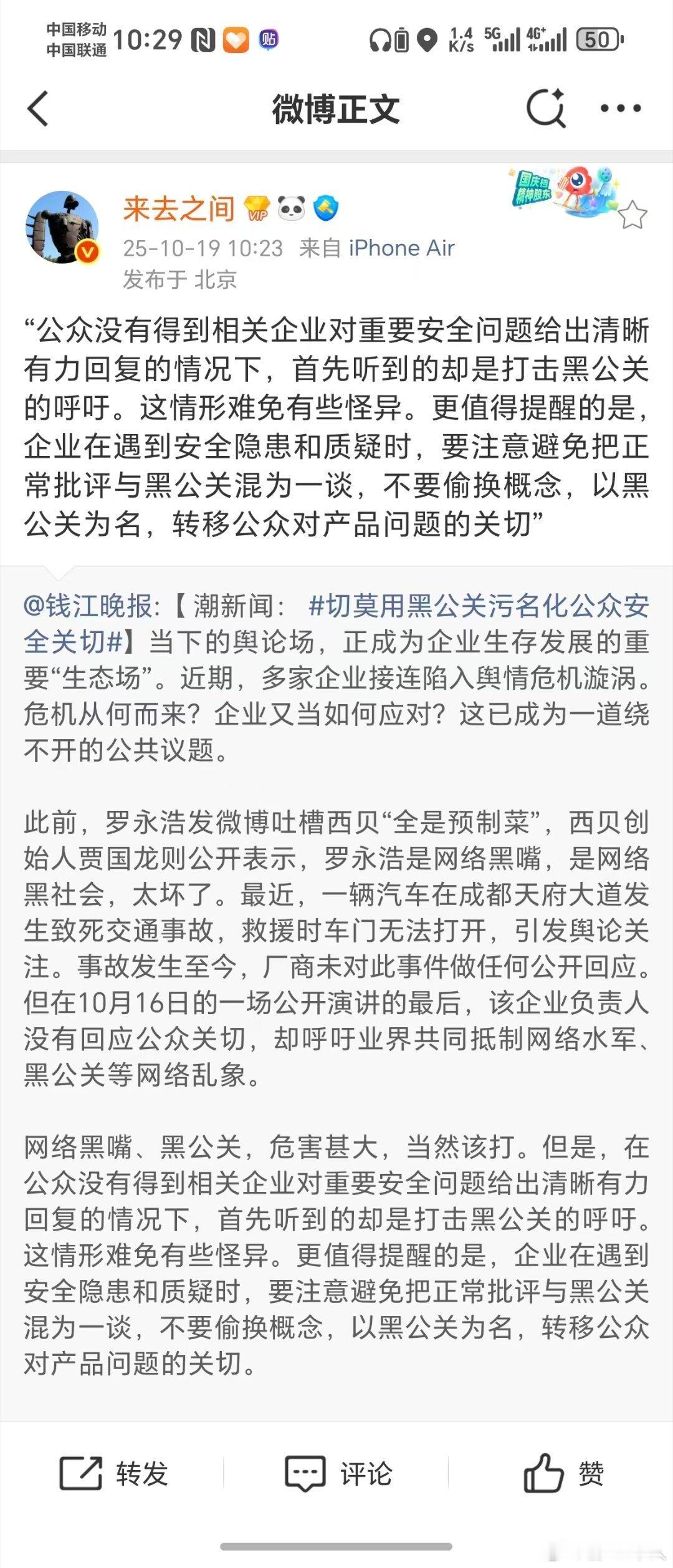 舆论环境要允许批评和质疑,不能随便的扣上黑粉,黑公关。这些批评是对公众安全的一种关切,如果没人批评,那才是最可怕的。