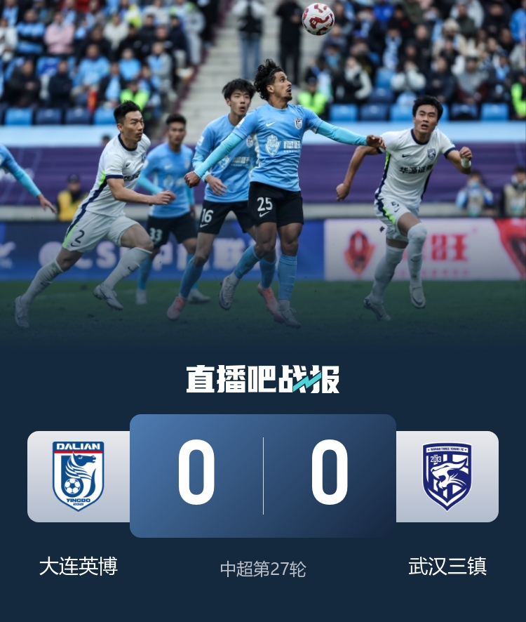直播吧10月19日讯中超第27轮,大连英博坐镇主场中升梭鱼湾足球场迎战武汉三镇。上半场,刘祝润、朱鹏宇造险,邓涵文伤退。易边再战,马马杜造险+中楣,龙威门线解围,郭嘉宇神扑救主。最终大连英博0-0武汉三镇。积分榜方面,大连英博四轮不胜34分仍第十,武汉三镇25分第十二。