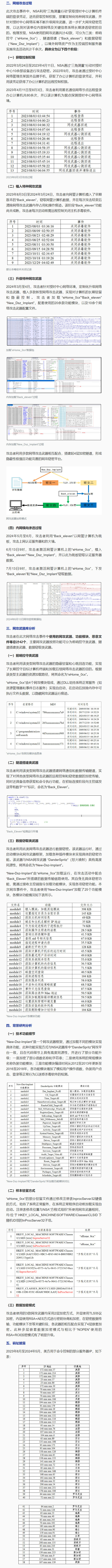 此次攻击事件中,NSA利用“三角测量行动”获取授时中心计算机终端的登录凭证,进而获取控制权限,部署定制化特种网攻武器,并针对授时中心网络环境不断升级网攻武器,进一步扩大网攻窃密范围,以达到对该单位内部网络及关键信息系统长期渗透窃密的目的。梳理发现,NSA使用的网攻武器共计42款,可分为三类:前哨控守(“eHome_0cx”)、隧道搭建(“Back_eleven”)和数据窃取(“New_Dsz_Implant”),以境外网络资产作为主控端控制服务器实施攻击活动共计千余次。具体四个阶段详戳↓↓