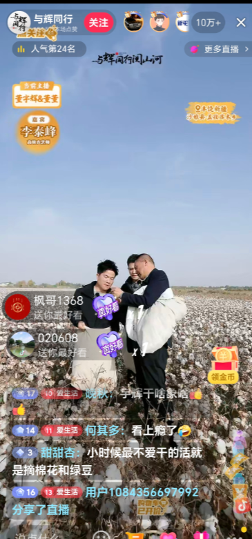 太有趣了,今天与辉同行的直播间是董宇辉在新疆下地里摘棉花,刷到视频的时候,我都噗
