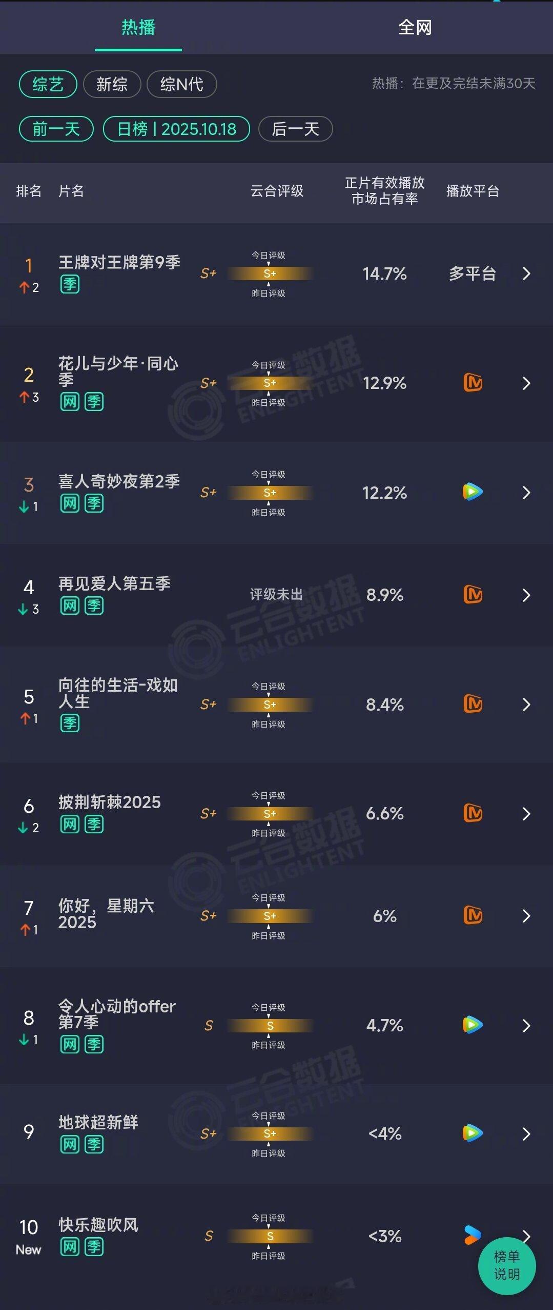 2025年10月18日云合综艺正片有效播放量市占率TOP10