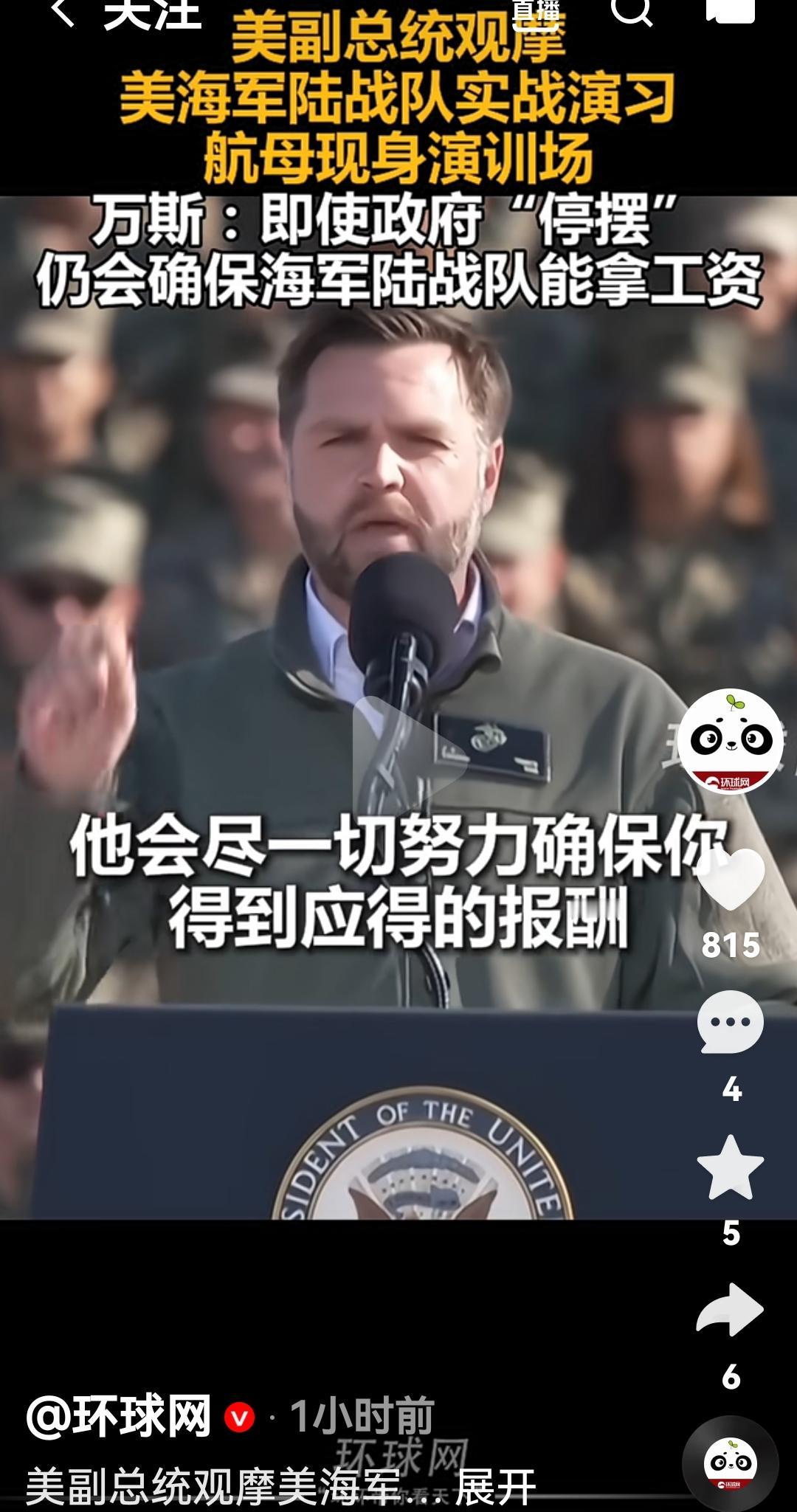 美国副总统万斯因为政府停摆上航母上安抚海军陆战队 根据美国媒体报道,10月18日美国副总统万斯到美国彭德尔顿营地举行了美国海军陆战队成了250周年纪念活动 万斯观摩了海军陆战队的实弹演习,他在演讲中说即便美国政府停摆,美国总统特朗普说他会尽一切努力确保海军陆战队军人及时拿到应得报酬 这是特朗普派得万斯过来亲自安抚军人来了啊,看来美国政府停摆这次要突破一个月,不会马上结束了老美副总统万斯 美副总统万斯 万斯联合国发言 图片来自环球网视频