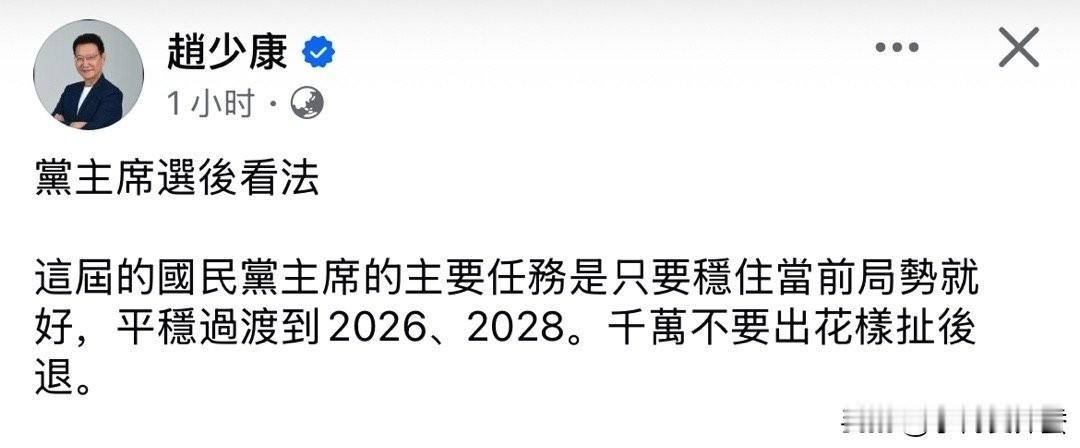 就想看看赵少康自己挖的坑怎么填,结果这家伙今天写了篇《党主席选后看法》的小作文,居然绕开了。表面是分析选后那点事儿,其实是在给郑丽文递话。 他先是说,党主席最该做的是稳住局面,千万别出花样拖后腿。这话明摆着是说给郑丽文听的:别搞激进的,在两岸和路线问题上得求稳。 还提到,地方上的县市长手里有自己的预算和权力,要是国民党党中央定的政策跟地方、立法院不对路子,人家说不定就各玩各的了。 这话翻译过来就是提醒郑丽文:别觉得当了主席就啥都能管,得给地方势力和党内不同派系留面子,别想着把权力都攥在自己手里。 最关键的是,他说要“降低消除亲中力量”,又翻来覆去强调国民党选举是在岛内选、选民在岛内,得“追求岛内最大利益”。他还妄言“统独中间还有很多选择”,本质就是想维持不统不独的分裂现状。 这就差直接说出口了,就是让郑丽文别往大陆靠拢,得围着岛内人的想法来,不然不光党内指挥不动,选举也没指望。 赵少康是真会算计,没做成郝龙斌背后的大哥,这又开始给郑丽文指方向了,真是没完没了。