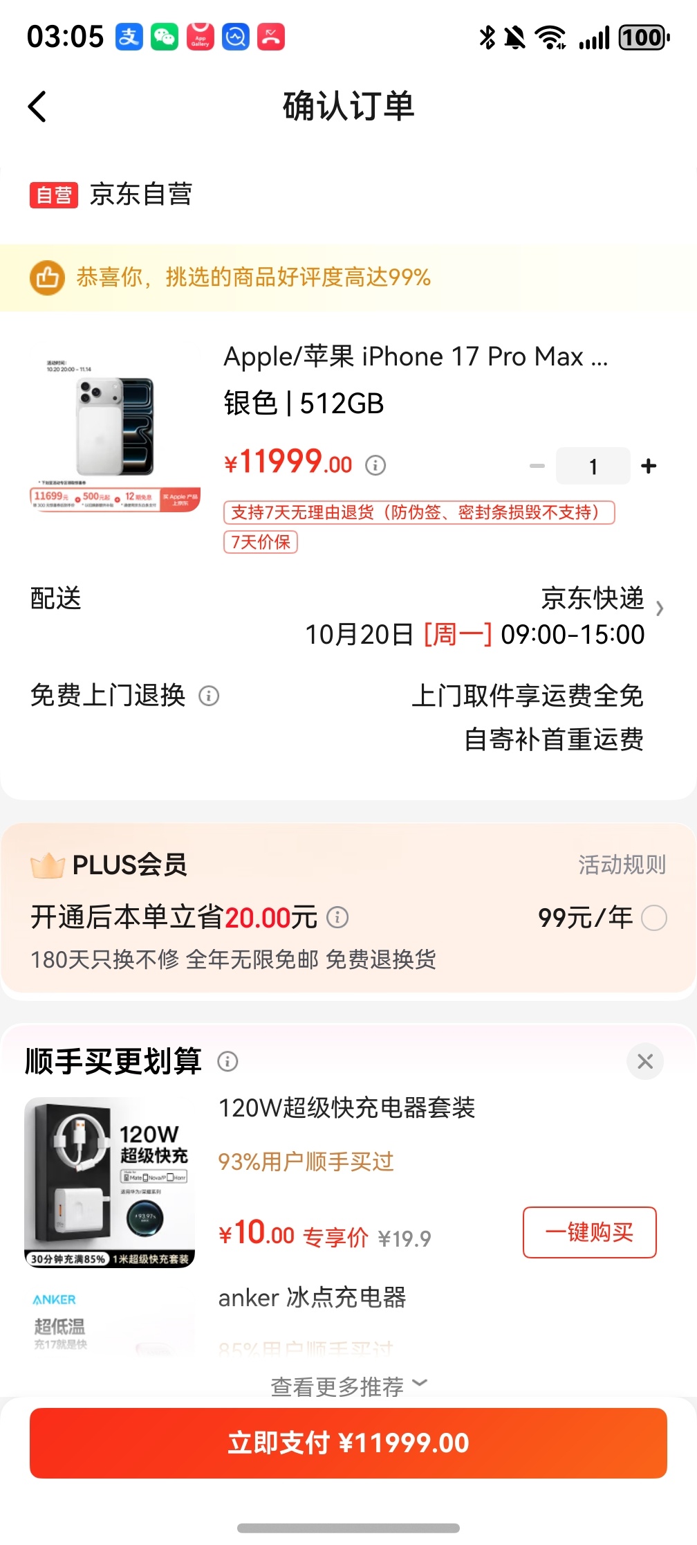 京东的17 pro max明天就能送货上门,结果苹果官方自己的焕新计划却要约到11月初