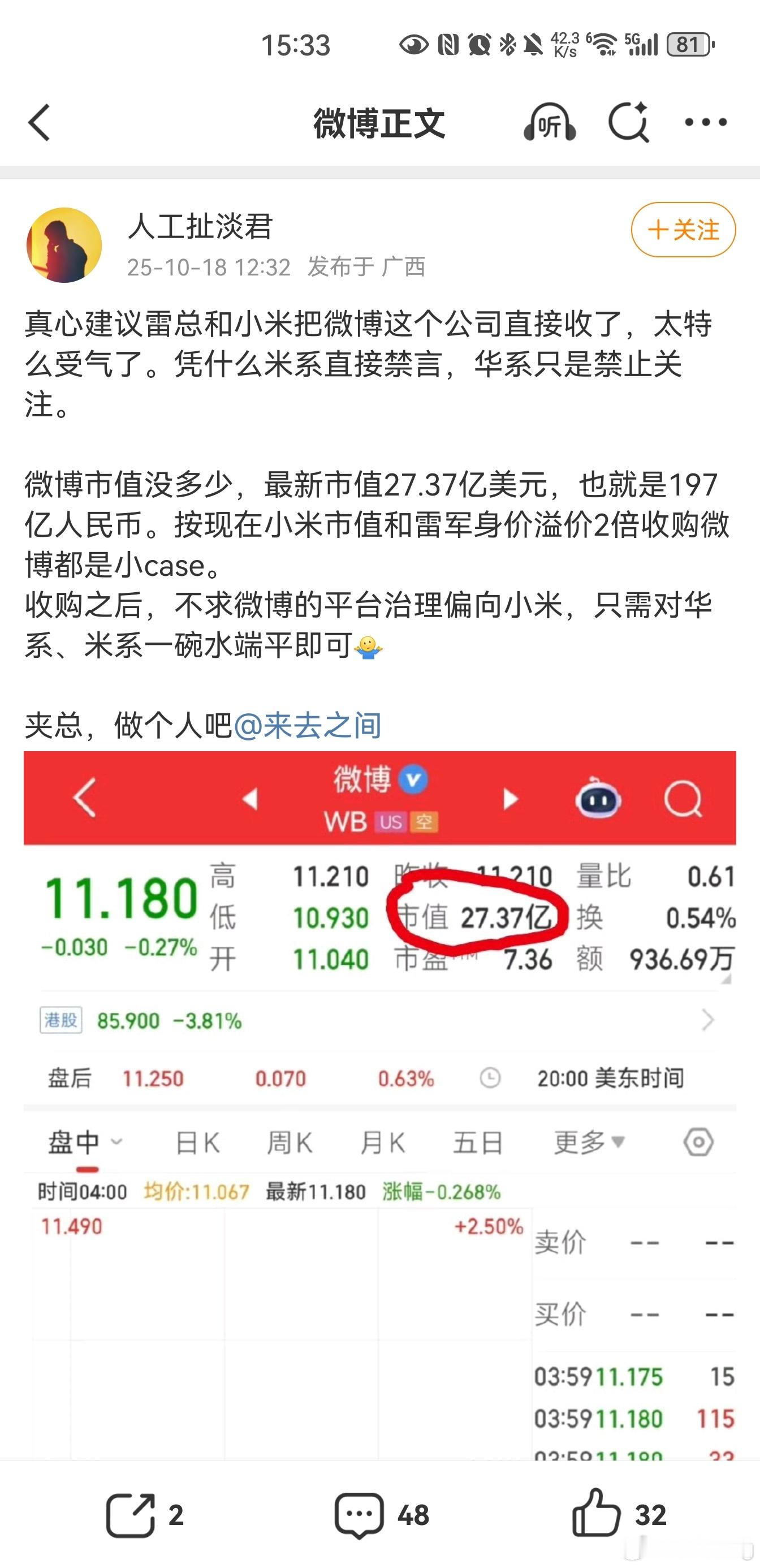 有人建议小米雷军收购微博,这下微博变成海狗了。胡锡进谈小米呼吁抵制黑公关和水军