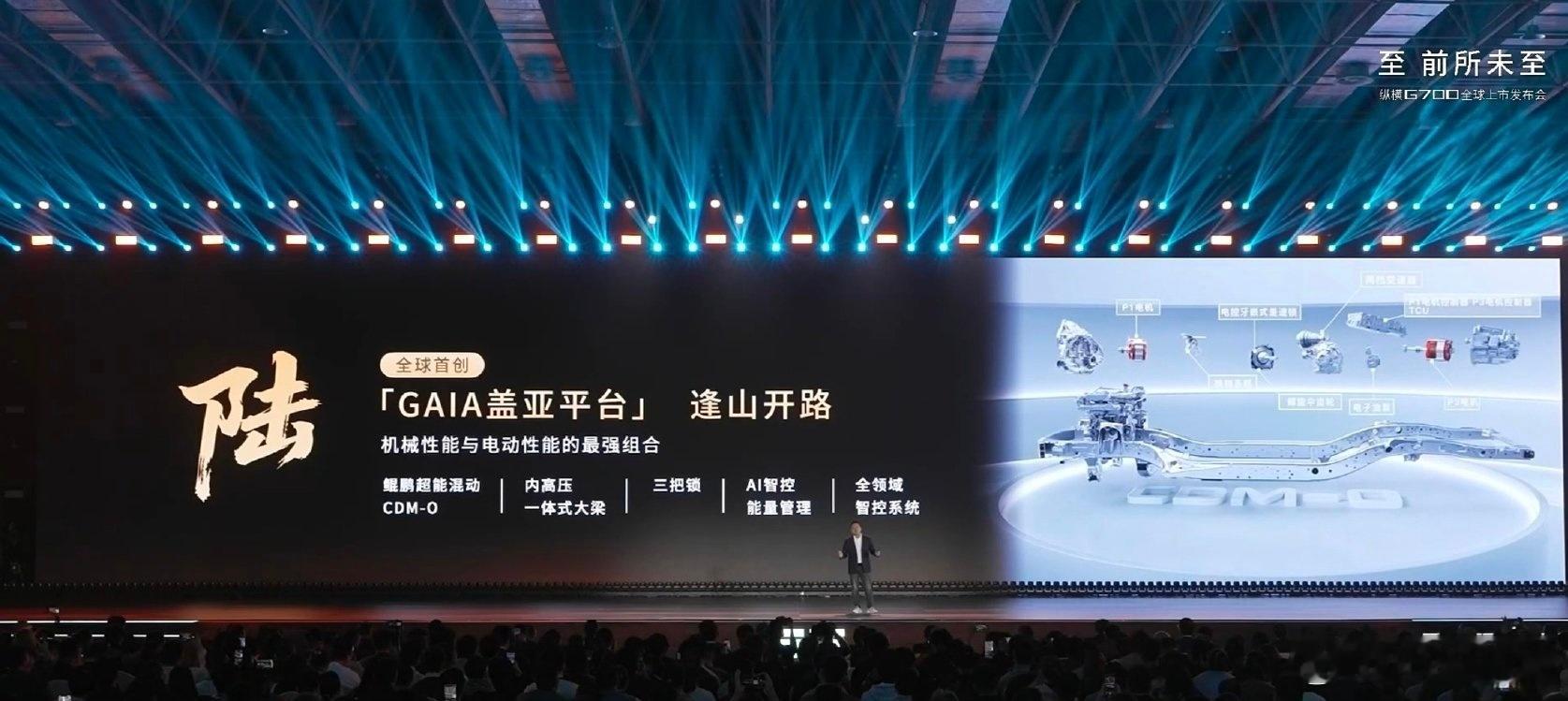 纵横G700搭载了鲲鹏超能混动CDM-O系统,采用2.0T混动专用发动机,再加上P1、P3、P4三个电机组成的真四驱,能输出665千瓦的综合功率和1135牛·米的峰值扭矩。