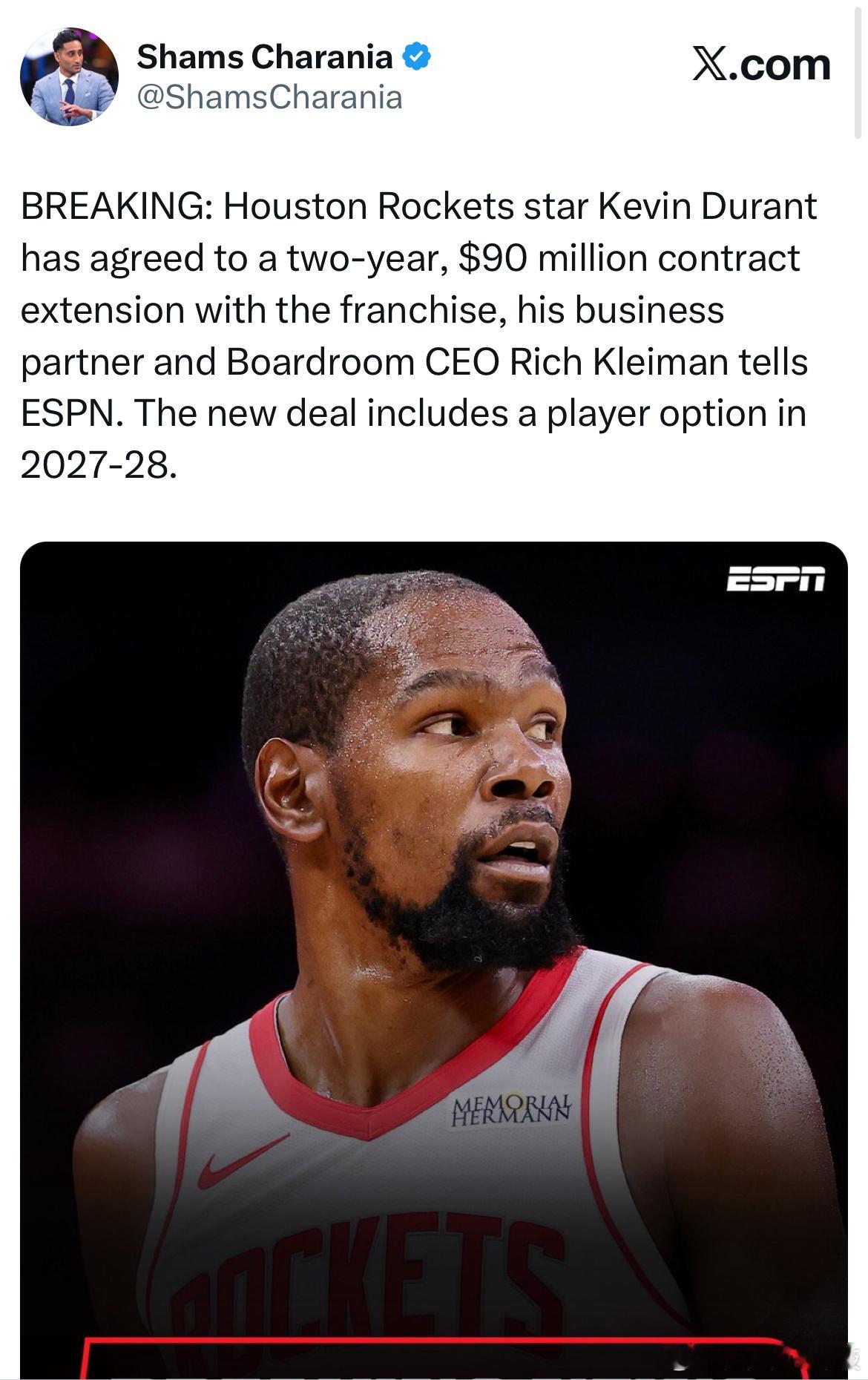 Shams:杜兰特两年9000万续约火箭!!