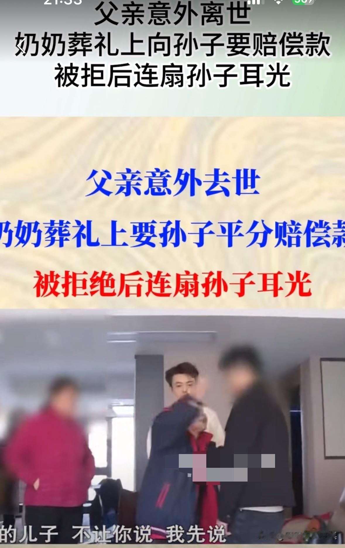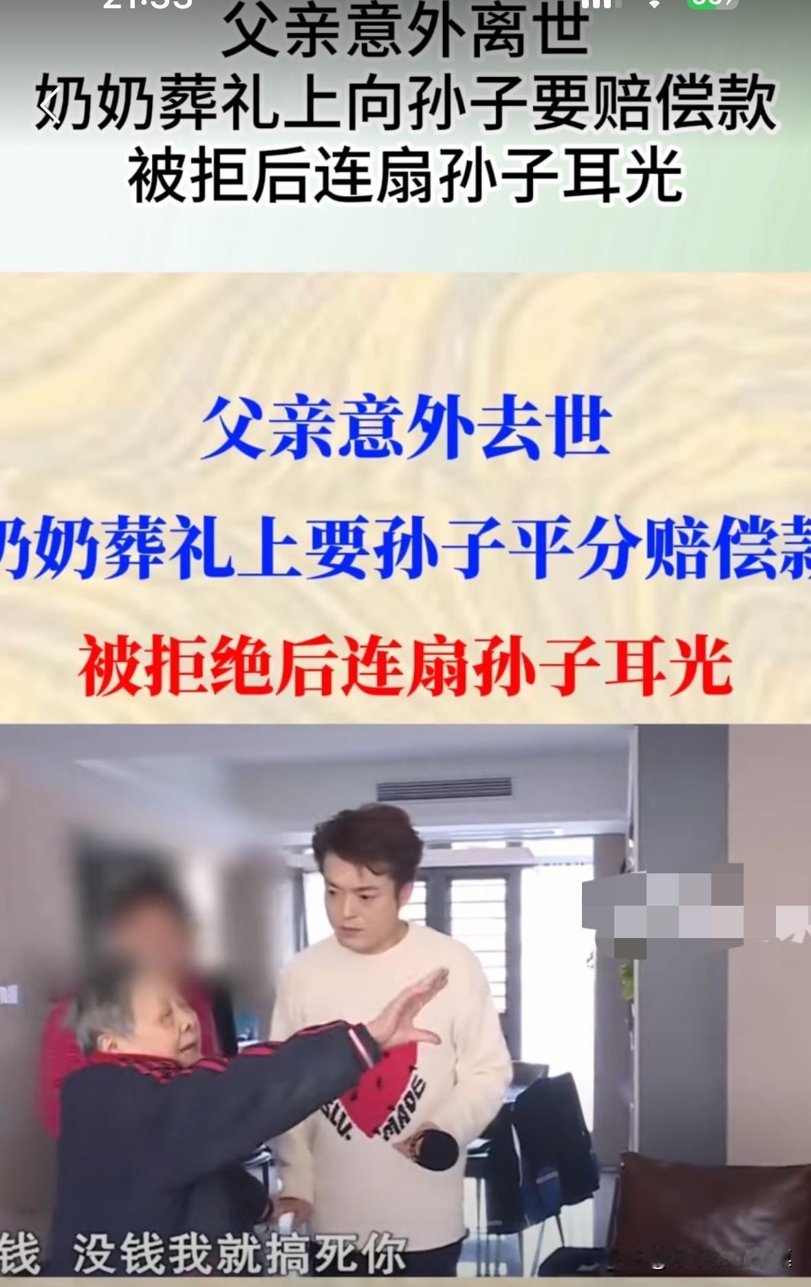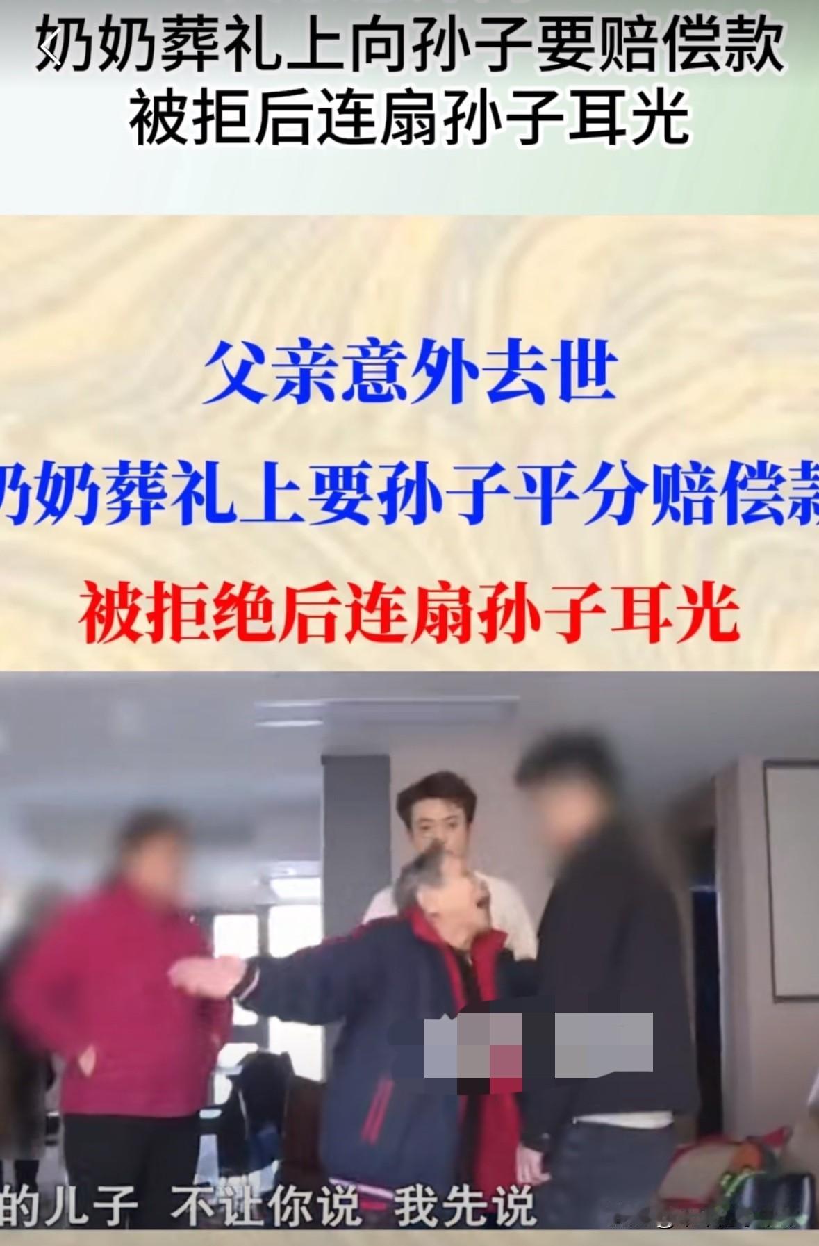 一位父亲意外去世,所得赔偿款全在儿子手中,奶奶却在儿子葬礼上大吵大闹,并向孙子索要赔偿款。 孙子不答应,奶奶就连扇孙子好几巴掌。 奶奶的眼里只有钱吗,儿子都死了,一点都不伤心吗?奶奶的做法确实很过分。 但是我觉得这个钱理应给奶奶一部分,毕竟她最后的依靠没有了,有点钱也会有点安全感! 孙子应该先安抚老人的情绪,父亲的葬礼办完后,商量一下老人的赡养问题。离世索赔