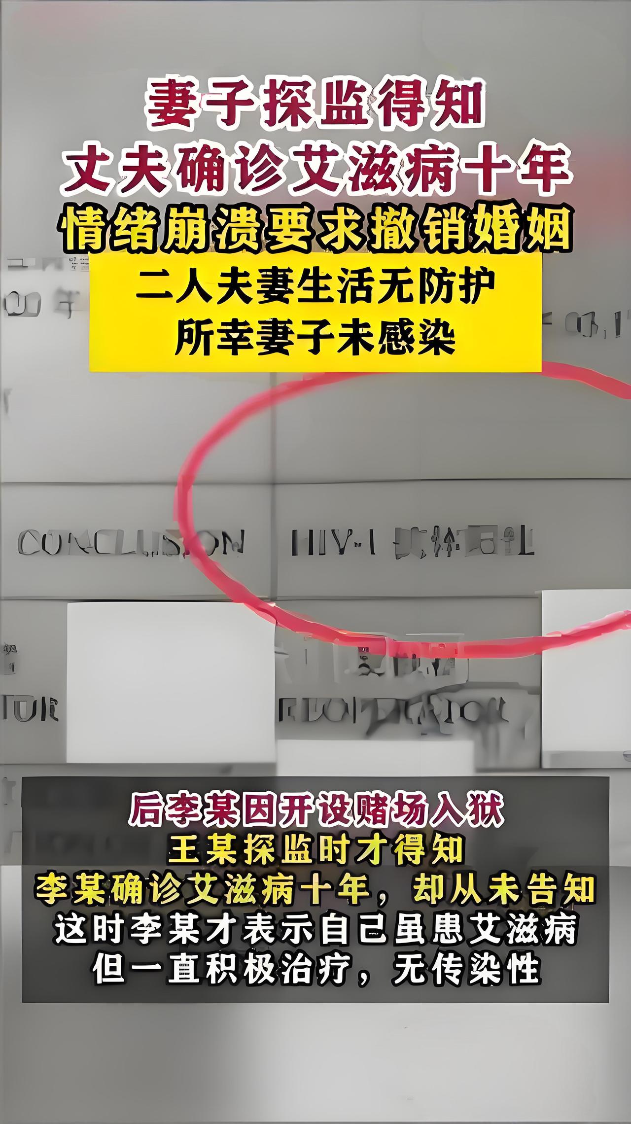 艾滋瞒了10年,一句“没传染性”就能算爱吗? 最近云南有个案子,一对夫妻结婚好几年,丈夫李某一直瞒着自己得了艾滋病,还骗妻子说是肝病要吃药。直到他因犯罪入狱,妻子王某探监时才得知真相——李某确诊艾滋病已经十年!两人婚后从没做过防护措施,虽然王某幸运没被感染,但精神上几乎崩溃。最后法院判决撤销了这段婚姻。 这事儿听着就让人头皮发麻!十年啊,枕边人每天带着可能致命的秘密,还若无其事地和你亲密生活。一句“我治疗了,没传染性”就能掩盖欺骗吗?婚姻最基础的信任,被他踩得粉碎。妻子没感染是万幸,可心理的阴影谁来赔?这种隐瞒根本不是“为你好”,是赤裸裸的自私! 更气人的是,要不是他进了监狱,这秘密恐怕还会被继续埋藏。婚姻里可以包容缺点,但绝不能包容恶意欺骗。法律判得好,撤销婚姻是对受害者最基本的尊重! 信任是婚姻的根,根烂了,树还怎么活?希望所有人在感情里都能坦诚相待,别让“秘密”毁了真心。你们觉得,这种隐瞒该被原谅吗?评论区聊聊你的看法!