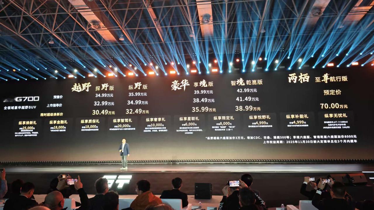 车盟快讯:今晚,纵横G700正式上市!新车共推出5款车型(包括两栖航行版);上市超级焕新价为:30.49~38.99万,航行版预定售价70万元;上市限时推出10重好礼!详情见图。这次上市不仅打破了豪华越野的价格门槛,更重新定义了越野智享的新范式。纵横G700定位 “全领域豪华电混越野 SUV”,它以创新的“水、陆、空”全领域硬核实力,成为百年汽车工业史上首款成功横渡长江的越野车。纵横G700正式上市的价格和产品力大家还满意吗?