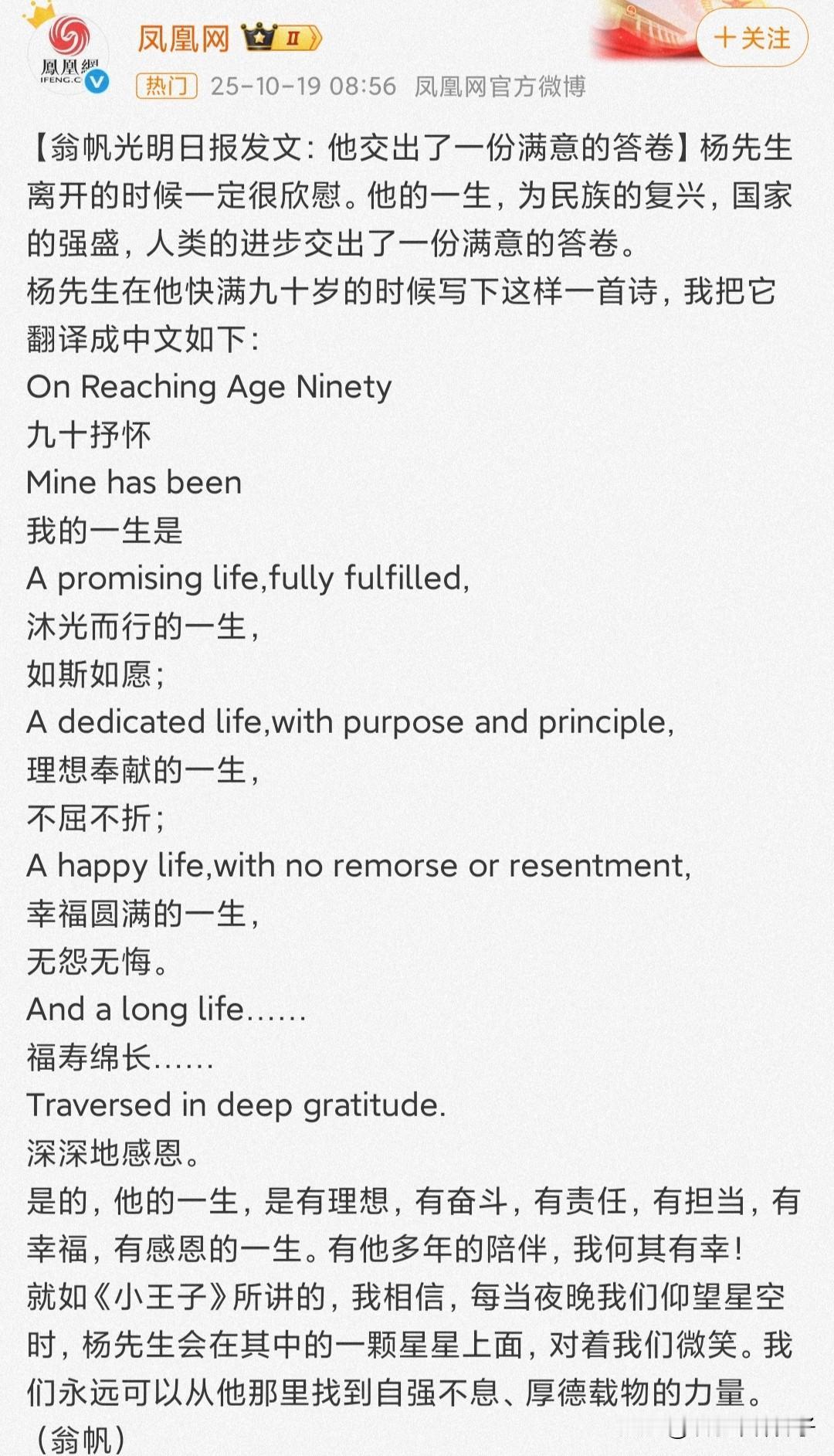 看到翁帆发文纪念杨振宁,内容让人肃然起敬! 10月19日,据媒体报道,翁帆发文纪念丈夫杨振宁,特意翻译了老先生90岁时创作的一首英文诗,颇有才华。 开头一番评价,充满对丈夫发自内心的赞美和崇拜。 看到翁帆这一句:“有他多年相伴,我何其有幸”,让人肃然起敬,20多岁嫁给先生,朝夕相处,如今已经49岁,纵然年华逝去,仍无怨无悔! 不得不说,老先生做出很大贡献,其实,翁帆亦是如此,如此体贴入微的照顾丈夫, 真的不容易。 愿逝者安息,一路走好,希望翁帆能节哀顺变,先生的一生是幸福圆满的。