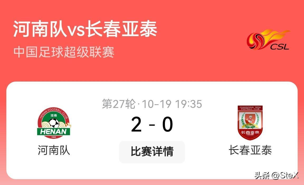 河南俱乐部酒祖杜康2比0长春亚泰 10月19日中超联赛第27轮比赛,河南俱乐部