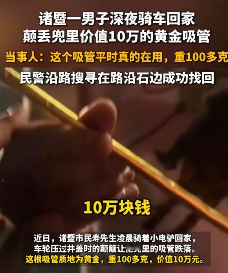 浙江一小伙报警,称自己丢失了一根吸管,让民警帮忙找找,民警一听还以为是捣乱的,结果,小伙却说,这根吸管不一般,是他用黄金打造的,专门用来喝奶茶,当得知这吸管有100多克时,民警都傻眼了! 浙江诸暨的寿先生,最近正计划明年夏天重新打一根黄金吸管——因为他之前那根值10万的黄金吸管,虽说丢了又找回来了,却因表面满是磕坑没法修复,只能先融成小金条。 这根吸管不是坏在日常用奶茶上,而是坏在一次意外丢失的过程里。 事情发生在一个秋夜,晚上8点多,寿先生加完班顺路买了杯芋圆波波奶茶,在店里用这根黄金吸管喝完后,急着回家,就把吸管塞进牛仔裤后兜,拉了一半拉链便骑上电瓶车出发。 诸暨老城区的小巷路灯本就暗,他没注意到路边有个松动的井盖,车轮压上去的瞬间车身猛地一颠,他只顾着扶车把,完全没发现吸管已经从后兜滑了出去。 等骑到小区楼下,准备把吸管放进专属绒布袋时,才发现后兜空了,这时候距离吸管掉落已经快20分钟。 发现吸管丢了,寿先生一下就慌了,赶紧骑电瓶车往回找。 巷子里没多少行人,路灯还坏了一半,他只能打开手机手电筒,一边慢慢骑车一边盯着路面,连路边的排水沟、汽车底下、草丛都仔细看,甚至蹲在地上扒开碎石堆找,就这么找了快一小时,腿都麻了,还是没看到吸管的影子。 他又急又心疼,这吸管值10万,而且当初家里人就觉得做这吸管太浪费,现在丢了肯定要被埋怨,实在没办法,只能打110报警。 接警的民警一开始听说是丢了根吸管,还挺疑惑,直到寿先生说清楚“这吸管是100多克纯黄金做的,上面还刻了奶茶杯小图案,值10万”,才赶紧联系巡逻队。 很快,诸暨市公安局城东派出所的樊海洋和寿笙超带着强光手电筒、便携式反光板赶了过来。 到现场后,寿先生指认了压井盖的位置,俩人立刻分工:寿笙超举着反光板调整角度,樊海洋用手电扫路面,从井盖往两边搜,落叶层、排水沟缝隙都扒开看,来回找了两圈,还是没见着吸管。 寿先生在旁边急得直跺脚,念叨着“找不到就算了,麻烦你们了,这要是丢了,损失太大了”。 这时候樊海洋突然想到,之前找过一根圆柱形保温杯,掉在硬路面上会顺着惯性滚出去,于是跟寿笙超说:“黄金吸管沉,又是圆的,肯定往前滚了,顺着他骑车的方向找。” 俩人顺着小巷往前挪了70多米,樊海洋的手电光扫到路沿石旁边时,反光板突然反射出一点金光,拨开杂草一看,果然是那根黄金吸管——上面的奶茶杯图案还清晰,就是表面磕了几个小坑。 寿先生赶紧跑过去,小心翼翼地把吸管拿在手里,反复用袖子擦,手心全是汗,嘴里不停说着“谢谢”。 后来因为吸管磕痕太深没法用,他才把吸管融了,打算明年夏天重新做一根,到时候会配个带密码锁的收纳盒,再也不随便往裤兜里塞了。 网友们对寿先生的黄金吸管事件讨论得挺热闹,有人说:“10 万做根奶茶吸管,果然浙江人消费观念不一样,我喝奶茶加个双份奶盖都要纠结半天,这差距太真实了!” 也有网友觉得实用角度有问题:“黄金吸管虽好,但揣裤兜骑车也太不注意了,那么贵的东西好歹整个专用收纳,掉了多心疼。” 还有人关注到细节:“居然还刻了奶茶杯图案,看得出来是真喜欢,不是单纯炫富,就是后续没保管好有点可惜。” 不少网友调侃:“幸好掉在路边没人捡,换我路过肯定以为是普通金属管,说不定还会踢一脚,现在想想还好没遇到这大宝贝。” 也有理性声音:“自己的钱怎么花都行,但贵重物品携带得小心,还好民警给力找回来了,不然 10 万就打水漂了。” 那么到最后,你们怎么看的呢? 如果各位看官老爷们已经选择阅读了此文,麻烦您点一下关注,既方便您进行讨论和分享,又能给带来不一样的参与感,感谢各位看官老爷们的支持!