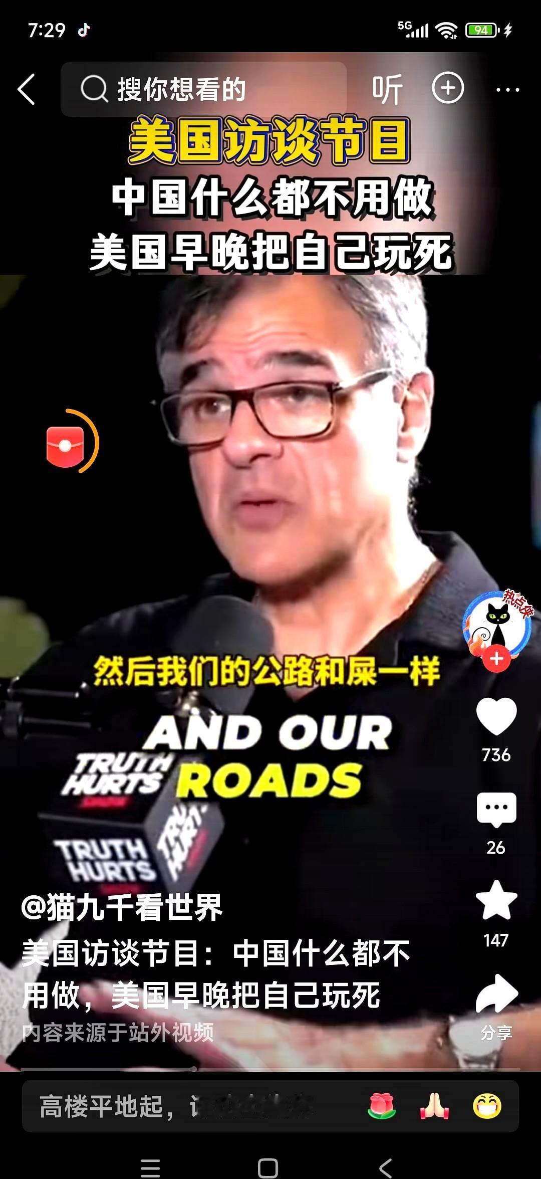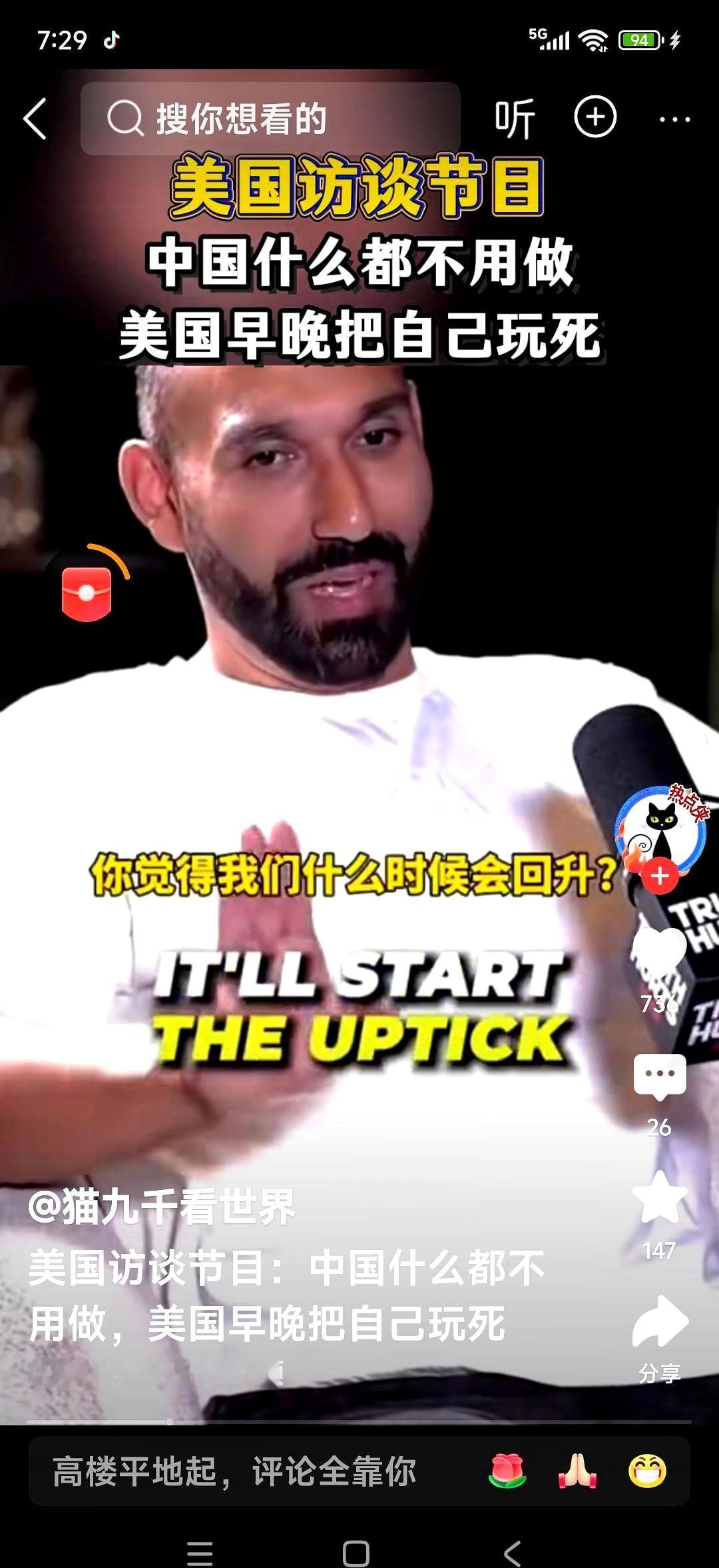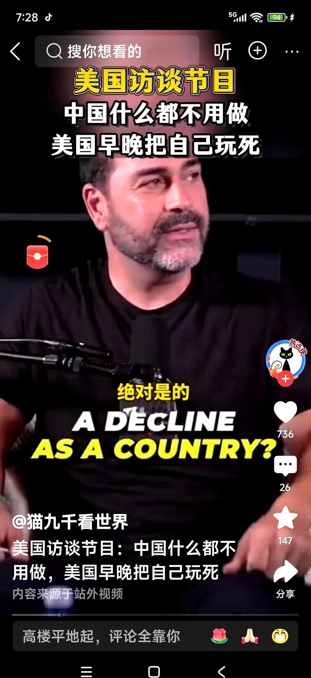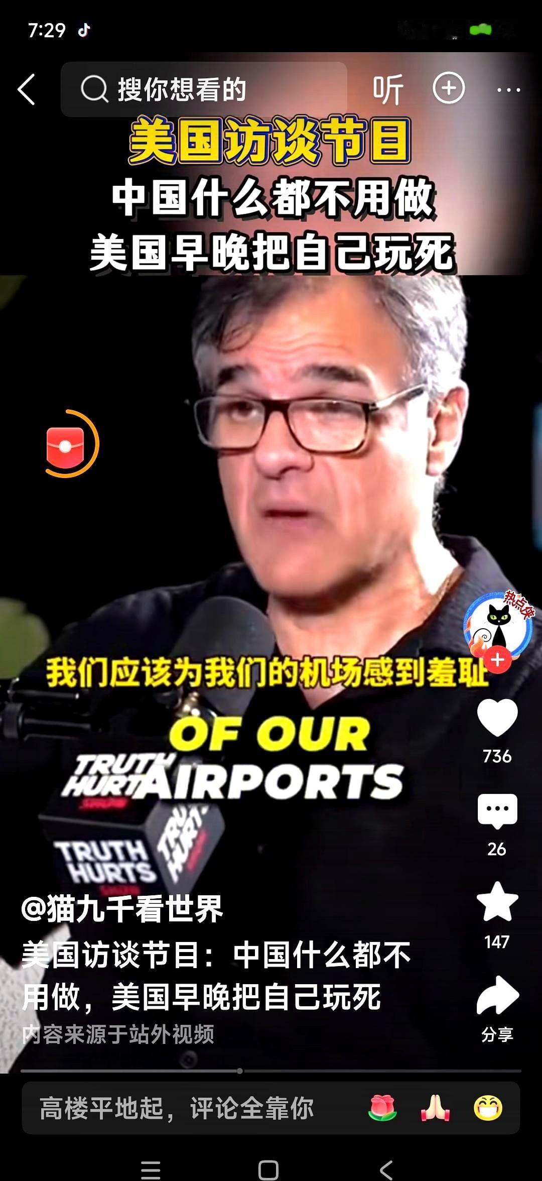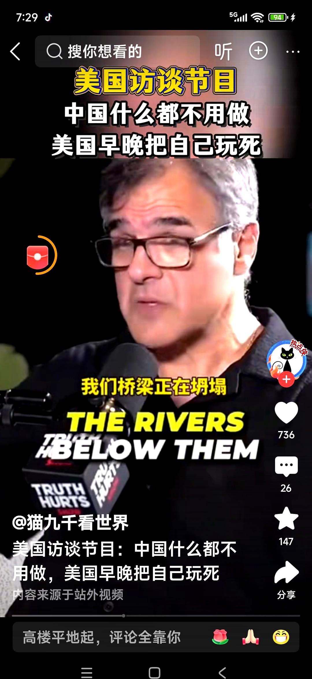 美国访谈节目:中国什么都不用做,美国早晚把自己玩死。 我们每年花费超过1万亿美元在军事上,公路跟屎一样,桥梁正在坍塌。 有的人说:就拿特朗普来说,一会儿打贸易战,一会儿又是关税战,最后结局就是把自己玩给“洗白了”。 网友对此说道: 美国就是一边靠金融寡头资本收割掠夺别国的资产,一边靠武力威胁恐吓别的国家,维持运转的。 一旦失灵,国家马上会出问题,这是必然的。 美国的底牌就是航母、隐形战机、反导系统。有办法克制住,它就会和你称兄道弟。 没有文化底蕴的国家就这样,因为运气好,吃了一战二战的福利,现在基本用干净了。 老美衰落是迟早的。 美国每年巨额的军费、巨额的贸易逆差、巨额的国债,这些都不是好兆头!