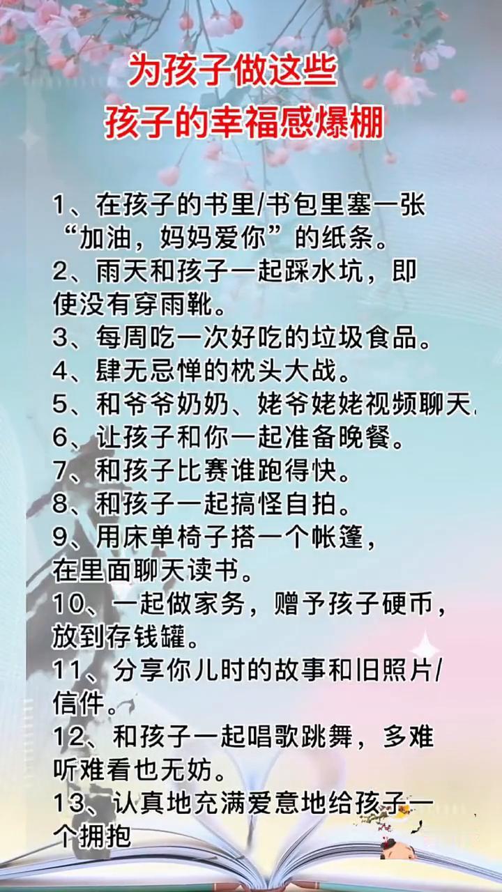 为孩子做这些,孩子的幸福感爆棚。 ·1、在孩子的书里/书包里塞一张"加油,妈妈爱你"的纸条。 ·2、雨天和孩子一起踩水坑,即使没有穿雨靴。 ·3、每周吃一次好吃的垃圾食品。 ·4、肆无忌惮的枕头大战。 ·5、和爷爷奶奶、姥爷姥姥视频聊天。 ·6、让孩子和你一起准备晚餐。 ·7、和孩子比赛谁跑得快。 ·8、和孩子一起搞怪自拍。 ·9、用床单椅子搭一个帐篷,在里面聊天读书。 ·10、一起做家务,赠予孩子硬币,放到存钱罐。 ·11、分享你儿时的故事和旧照片/信件。 ·12、和孩子一起唱歌跳舞,多难听难看也无妨。 ·13、认真地充满爱意地给孩子一个拥抱。