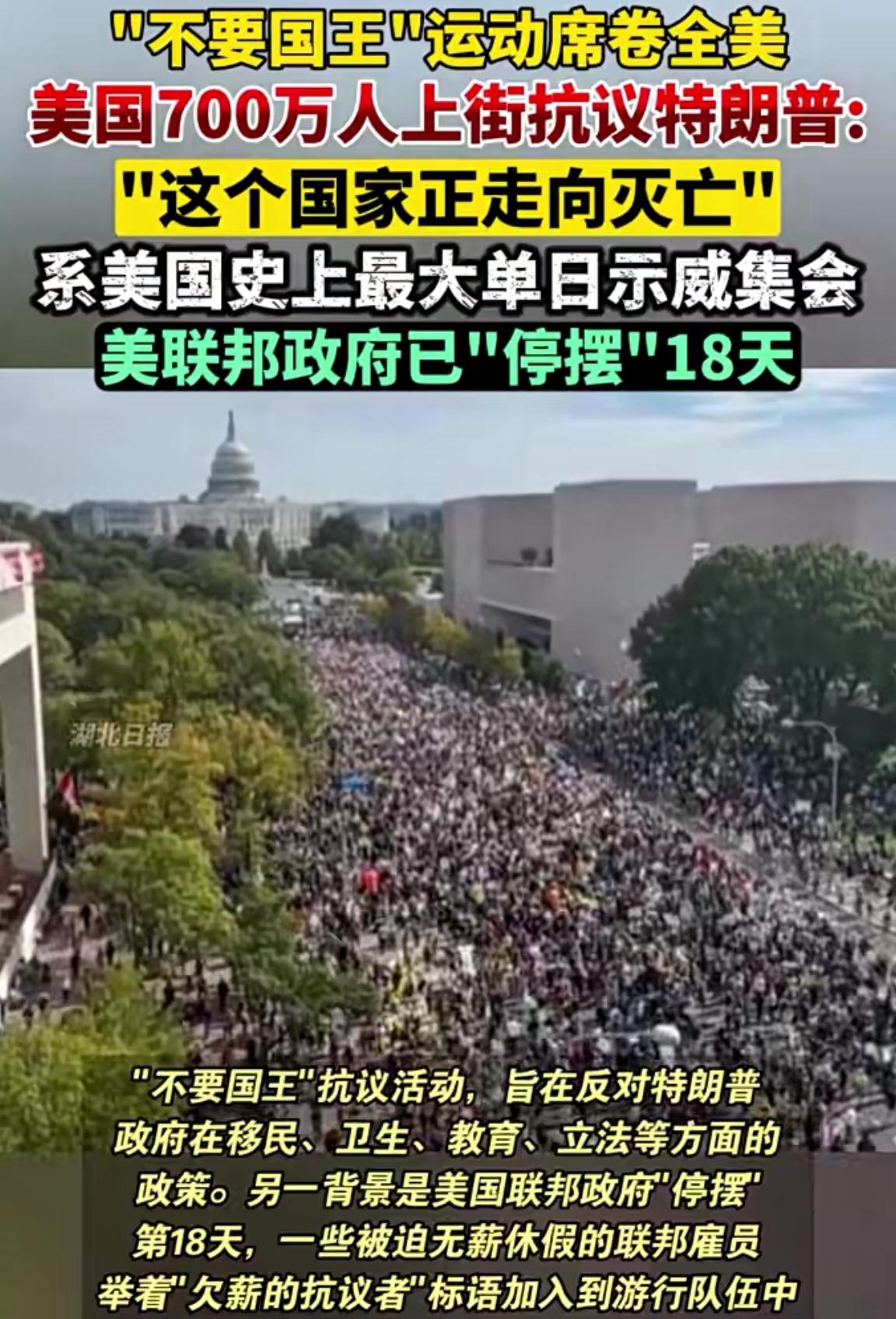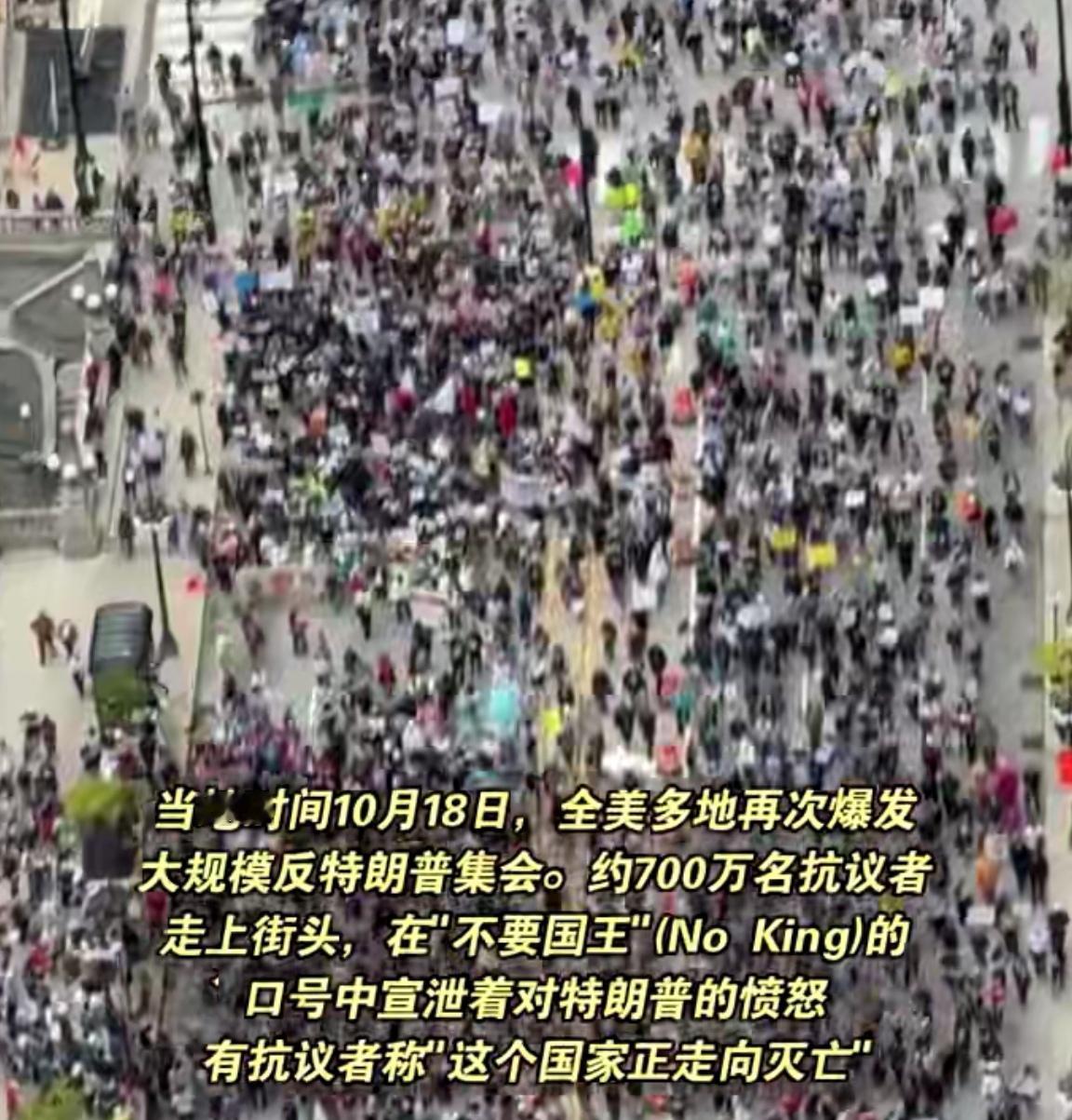 “不要国王”的呐喊:美国民主困局的现实注脚! 700万抗议者、2700个抗议点位,“不要国王”的呼声席卷全美,这场特朗普重返白宫后规模最大的示威活动,直指美国社会撕裂与民主制度的深层困境。 抗议者以“拒绝独裁”“反对权力滥用”的标语,控诉本届政府在移民、军事扩张等领域的强硬政策,背后是对权力过度集中的强烈忧虑。在美国“反独裁、限权力”的民主叙事下,民众需用街头示威捍卫权利底线,堪称对其民主神话的辛辣反讽。 两党的应对更暴露政治生态的僵化:共和党将抗议污名化为“仇美集会”,民主党因长期妥协丧失民众信任。当议会制衡失效、联邦政府停摆僵局难解,街头示威便成了民众表达诉求的唯一出口。值得关注的是,抗议已渗透到特朗普传统支持区,彰显美国社会对现有政治秩序的集体失望。 “不要国王”的呐喊,本质是对民主回归的迫切呼唤。若政治精英持续沉溺党争、无视民意,这场大规模抗议或许只是美国民主困局的开端,而非终结。权力终究要接受民众意志的审视,这是历史给出的必然答案。