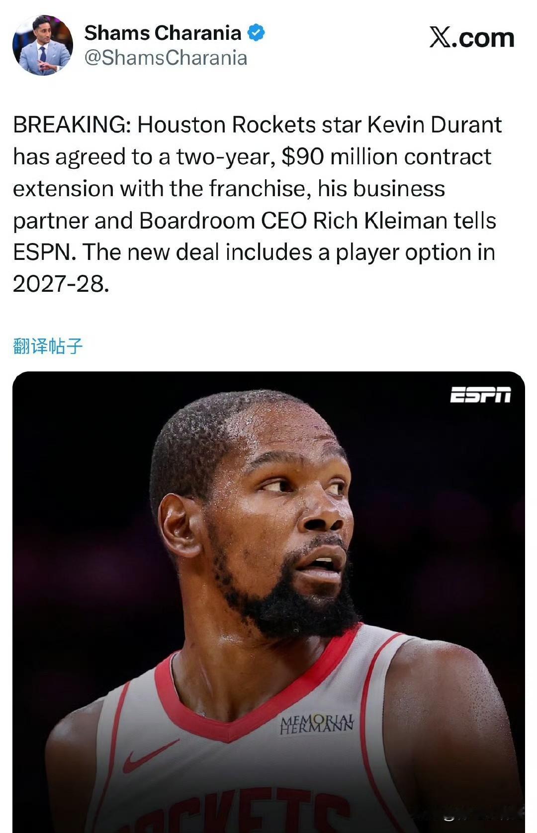 火箭赢麻了!!!杜兰特2年9000万续约火箭! 根据记者Shams:最新消息透露,超级球星凯文-杜兰特在新赛季揭幕战开始前和球队完成了续约,他和火箭签订了一份2年9000万美元的续约合同,最后一年拥有球员选择权。 火箭这波赚大了吧,每次他们都能顺利的让球员降薪,这也是他们的厉害之处,杜兰特直接降了3000万美元,太狠了。 杜兰特如果和球队正常签约应该有1.2亿,他已深知火箭的套路,去了火箭就不用想着拿顶薪了,这也是他自己的选择,没有办法,谁让现在的处境尴尬到这里了呢! 杜兰特本次降薪续约也是为球队提供便利,让火箭能够有机会续约其他球员或者保持薪资的灵活性。 恭喜杜兰特,恭喜火箭!