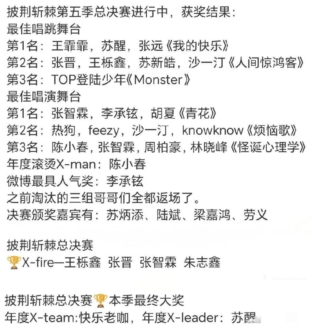 披荆斩棘总决赛,快乐老咖战队大获全胜!苏醒终于追上了陈楚生[捂脸]! 快乐老咖获得团队冠军,苏醒获得X-leader,王栎鑫获得X-fire,张远和王铮亮没有个人奖项,但是《我的快乐》获得了唱跳第一名,王栎鑫的《人间惊鸿客》获得了唱跳第二名,这样看来,只有王铮亮做了陪衬啊,还好他上一季是X-leader! 再就业兄弟们在苏醒的带领下大获全胜,人气高热大,这一整季奉献了最多话题,连续三季的披荆斩棘被再就业兄弟们承包了,按这个顺序,明年的披荆斩棘还有陆虎,明年的歌手该有苏醒[大笑]!苏醒