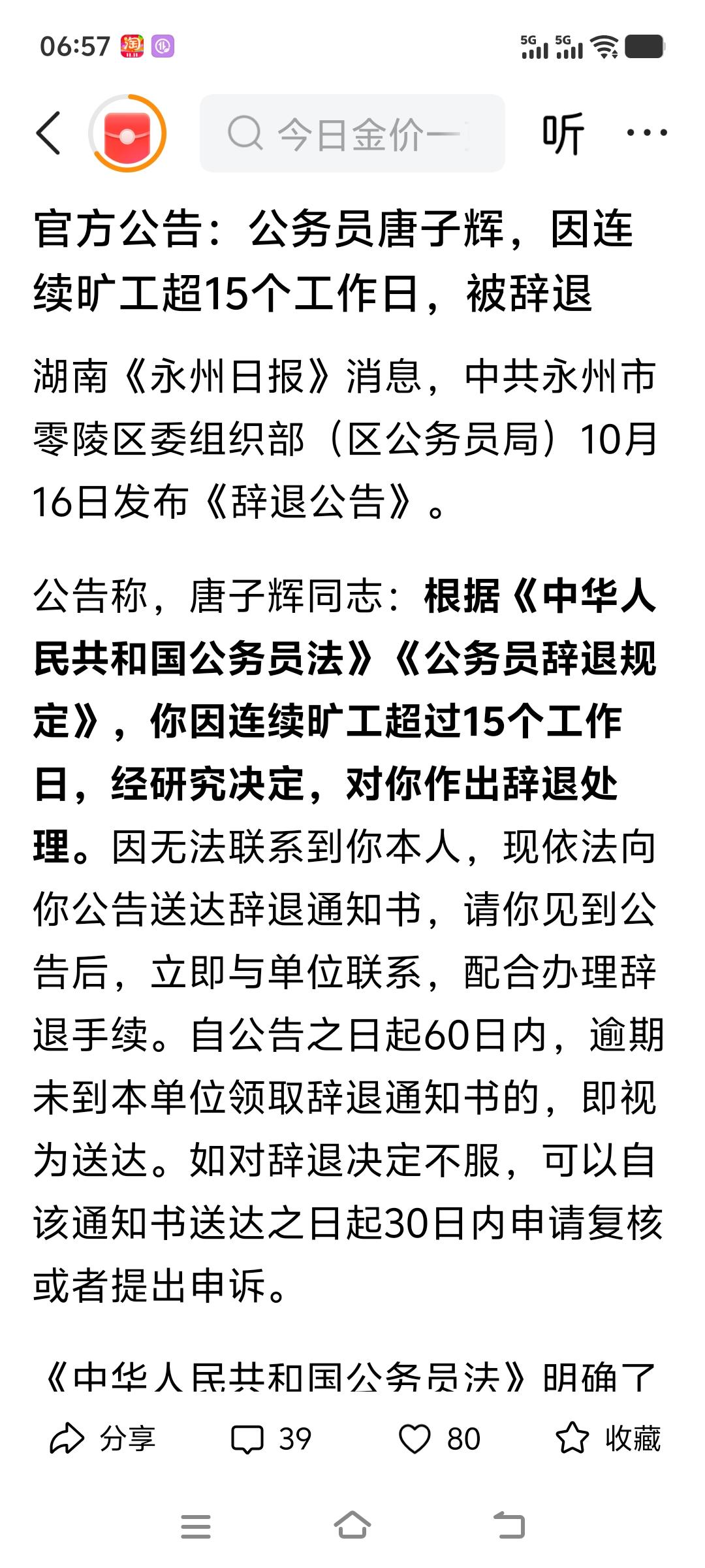 别再说公务员是铁饭碗了,这不,有个人15天没去上班,结果就被辞退了。而且公务员被