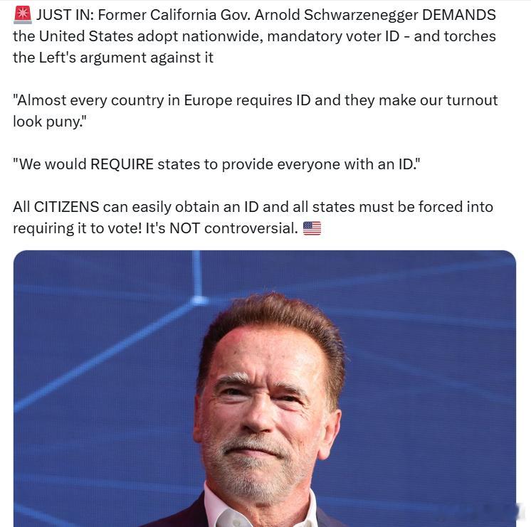 前加利福尼亚州州长阿诺德·施瓦辛格强烈要求美国在全国范围内实行强制选民身份证制度,并抨击左派对此的反对理由。