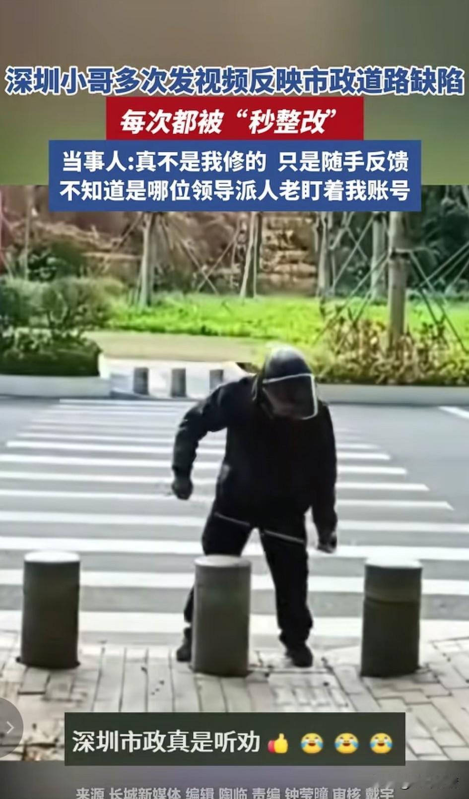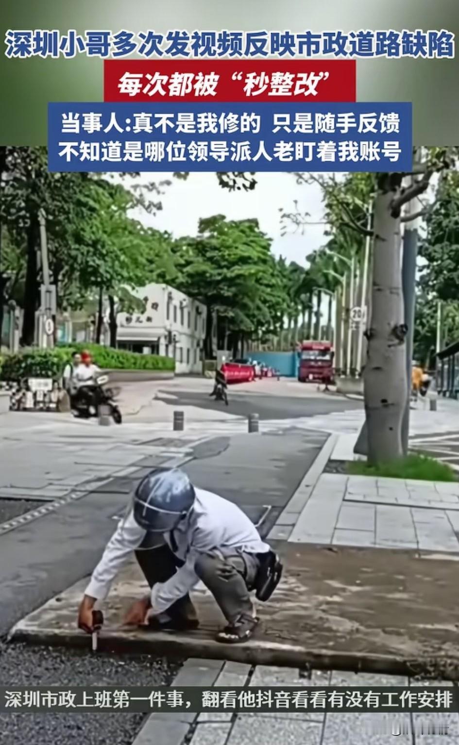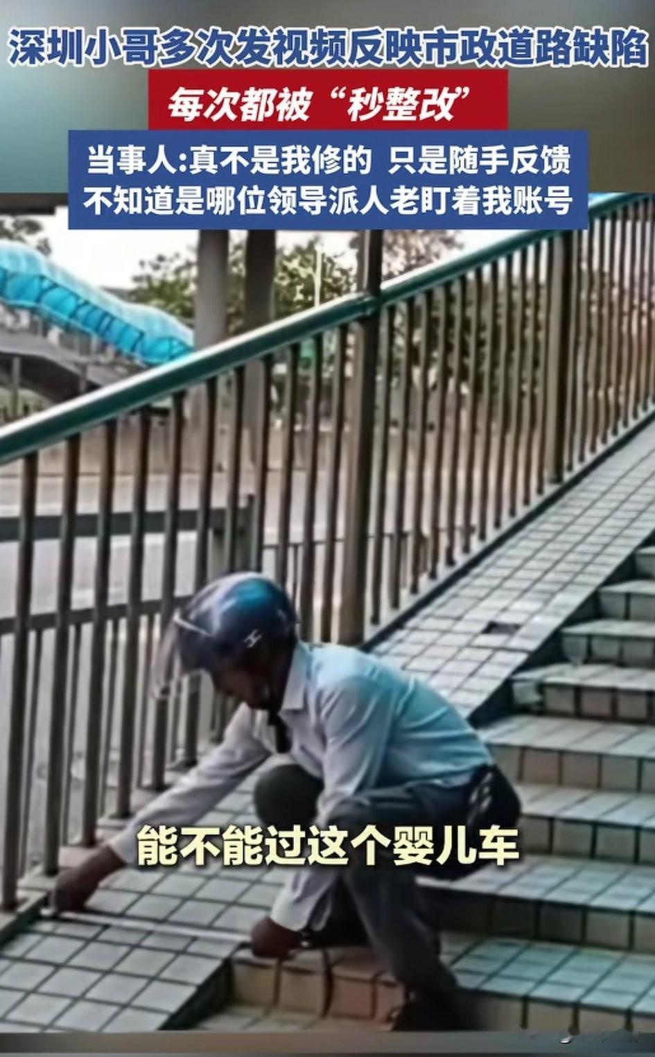 终于知道深圳为什么发展这么快了, 那是因为人家的行政效率是真高, 遇到市民反映问题就光速解决, 而不是去解决发现问题的人, 深圳一小哥只是下班随手拍城市发展的问题,结果深圳市政光速解决, 把他都搞蒙了, 感觉市政领导仿佛派人专注了他的账号,他一发布问题视频, 市政马上就能修好, 他发现有危墙不安全, 前脚发视频后脚就有人把危墙加固了, 当他看到天桥滑坡宽度过窄婴儿车过不去又发了个视频, 结果还没几天斜坡居然被拓宽了还加了防滑材料, 更离谱的是一处人行道道路不平, 结果也是迅速整改到位, 他发现有井盖碎了很危险, 也是迅速有人换了新的井盖, 网友笑称深圳市政上班第一件事就是看他有没有工作安排! 大家觉得深圳市政是不是很厉害! 深圳 深圳身边事 深圳城市现状 深圳经济增速 深圳城市日常