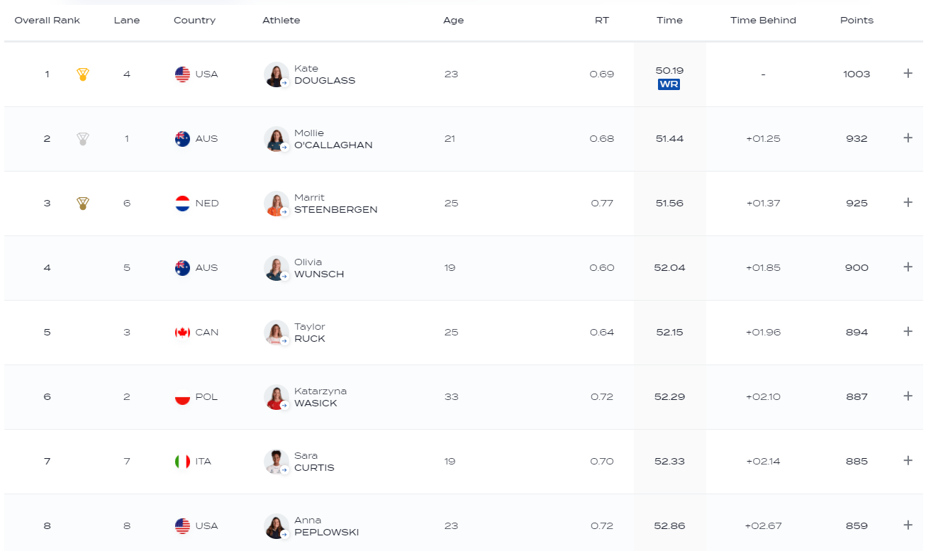 澳大利亚选手奥卡拉汉51米44获得银牌,荷兰选手斯腾贝亨51秒56获得铜牌。