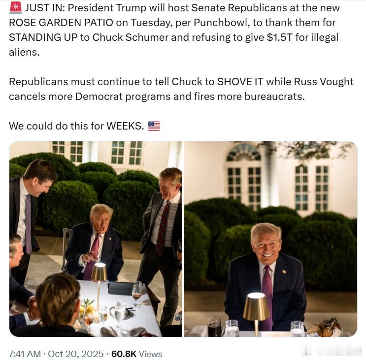 特朗普总统将于周二在新玫瑰园露台上招待参议院共和党人,以感谢他们对抗参议院多数党领袖查克·舒默,拒绝为非法移民提供1.5万亿美元的资金。