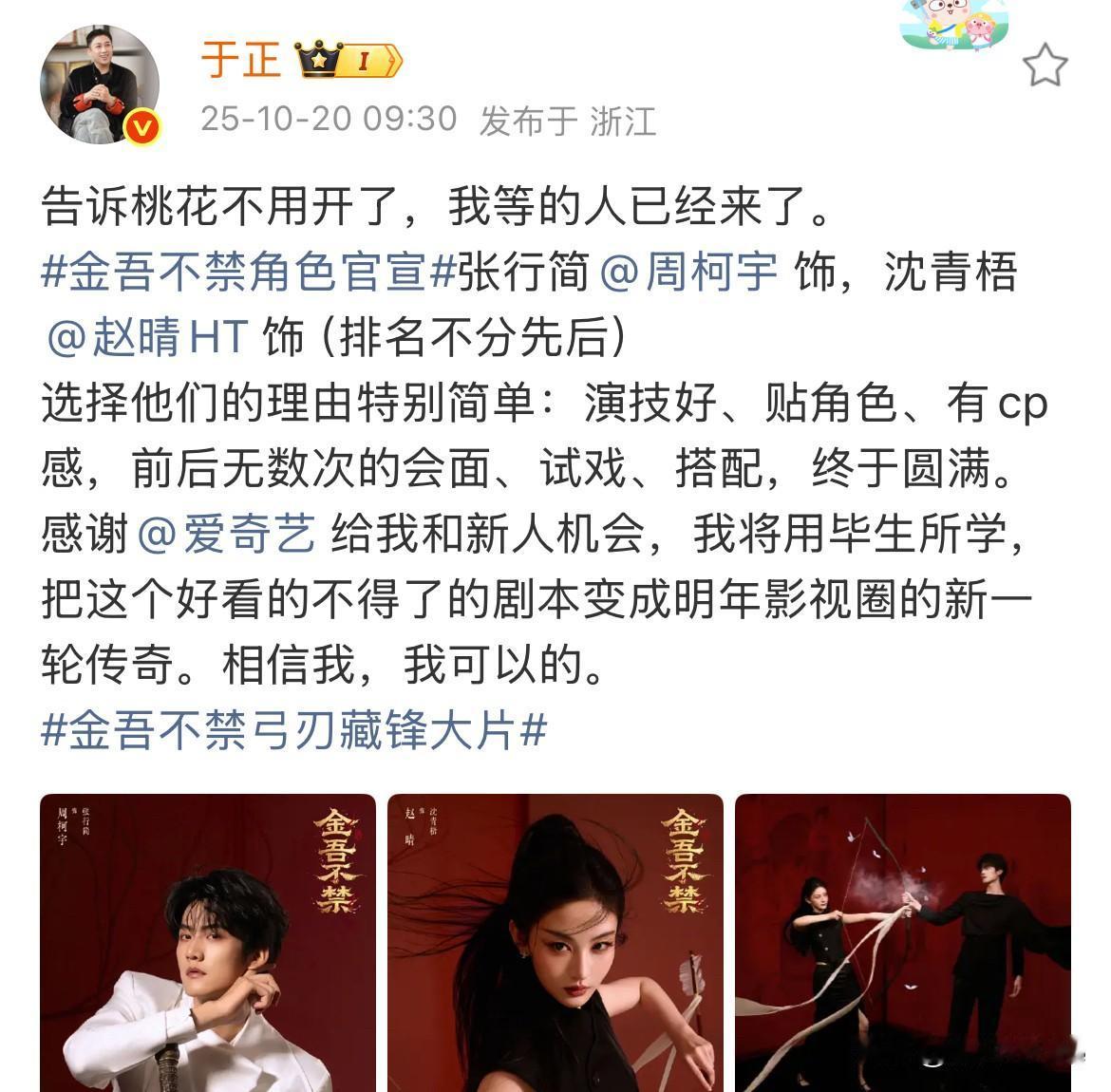 10月20日,于正官宣《金吾不禁》,吹嘘了大半年的阵容,让人看完一言难尽,周柯宇赵晴夏之光,牛皮吹的是S➕实际是A➕! 在内娱论挂羊头卖狗肉指鹿为马这块,还得是于正,虽然看过不少赵晴跟许凯的故事,但对赵晴本人不熟悉,先不予置评,说说男一男二,相比周柯宇,夏之光的知名度更高一些,周柯宇可能是投资方或者平台的人,于正签约夏之光,选择夏之光做男二,播出的时候肯定会有一波男二艳压男主! 之前觉得于正在捧赵晴,结果于正这几天一直在说赵晴周柯宇不抗剧,给观众打预防针,现在觉得于正捧的是夏之光跟他自己……