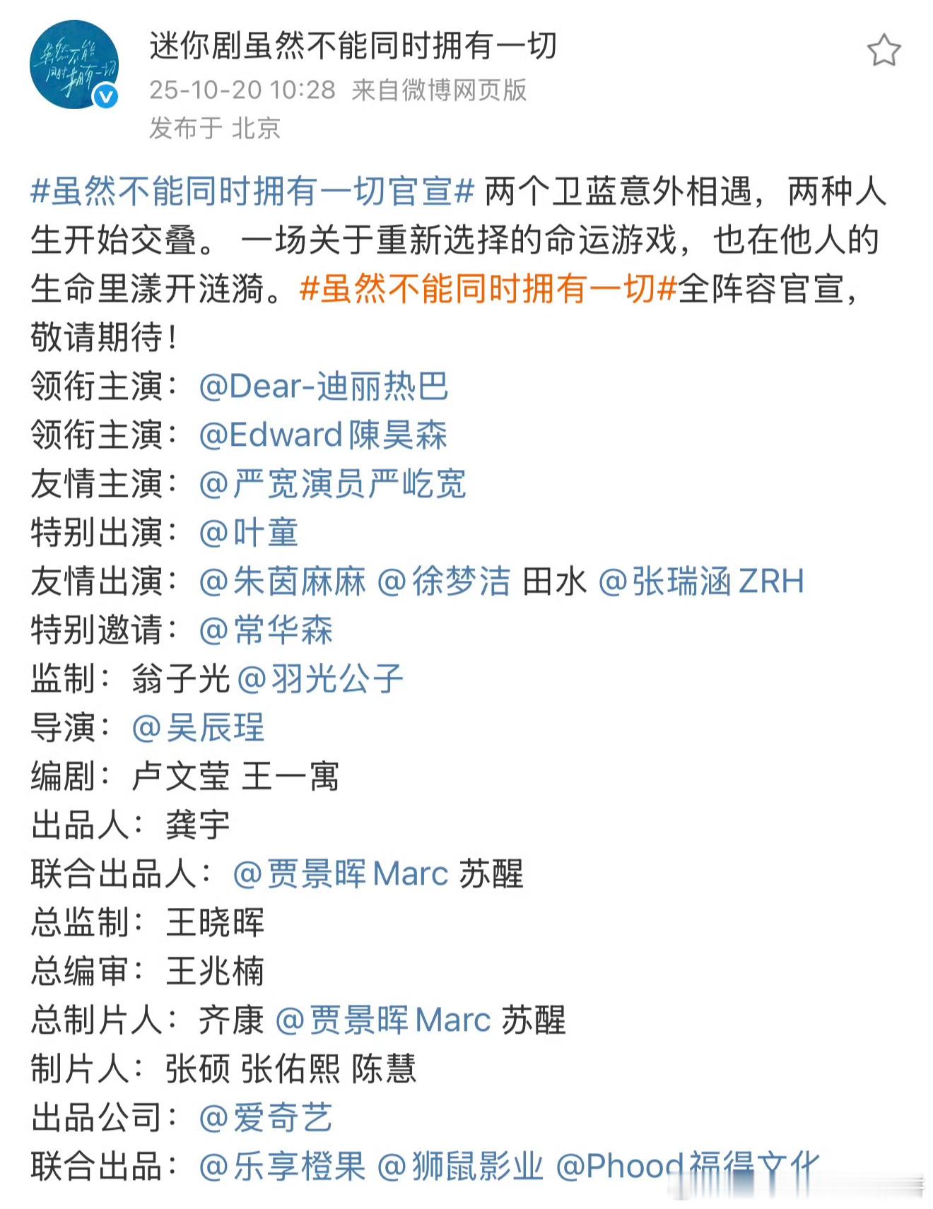 迪丽热巴的虽然不能同时拥有一切官宣:男演员们有:陈昊森、严屹宽、常华森特别出演: